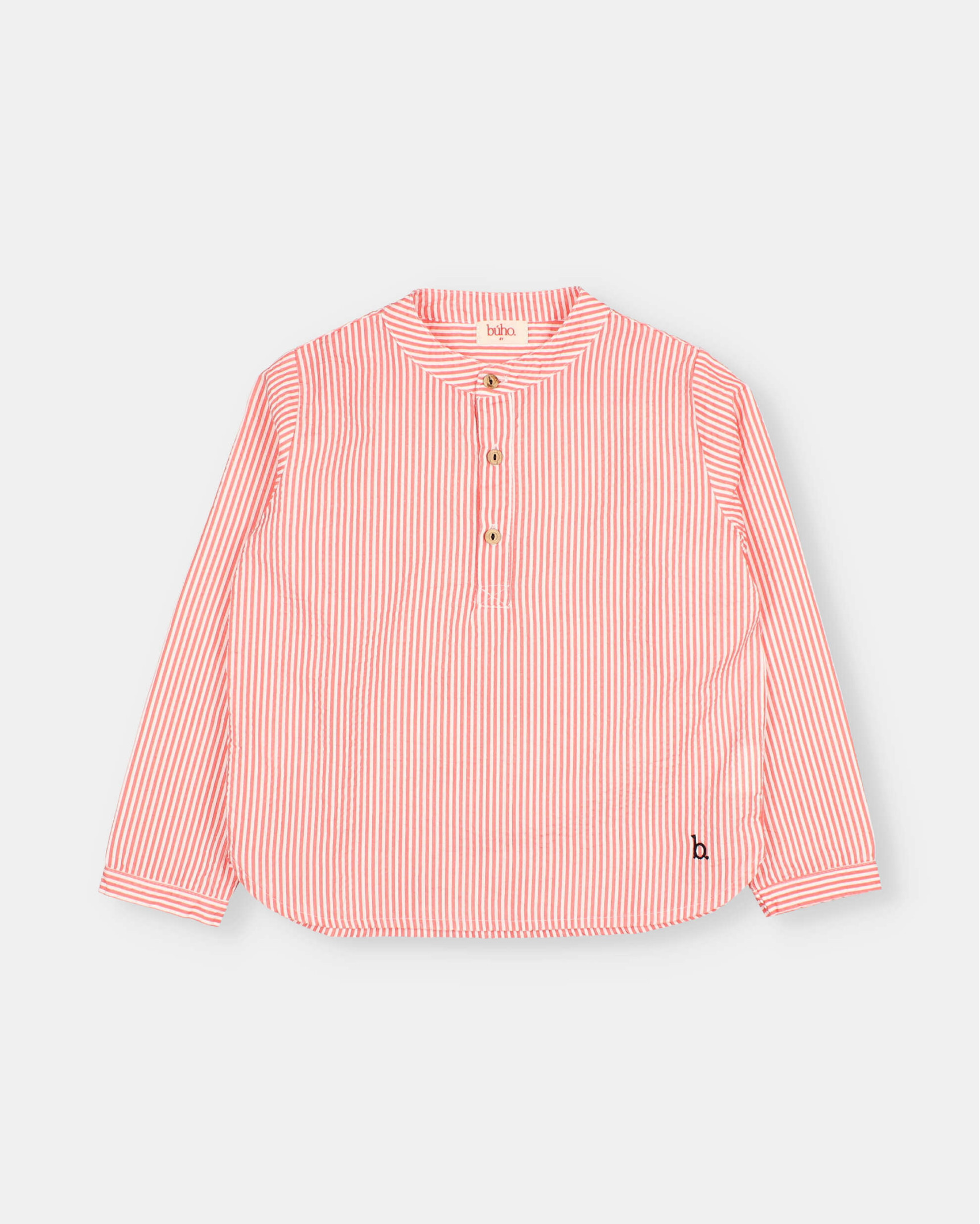 Long-sleeved cotton seersucker shirt with striped print. Mao collar. Button fastening on chest with wooden buttons. Contrasting embroidered detail on the side of the hem.