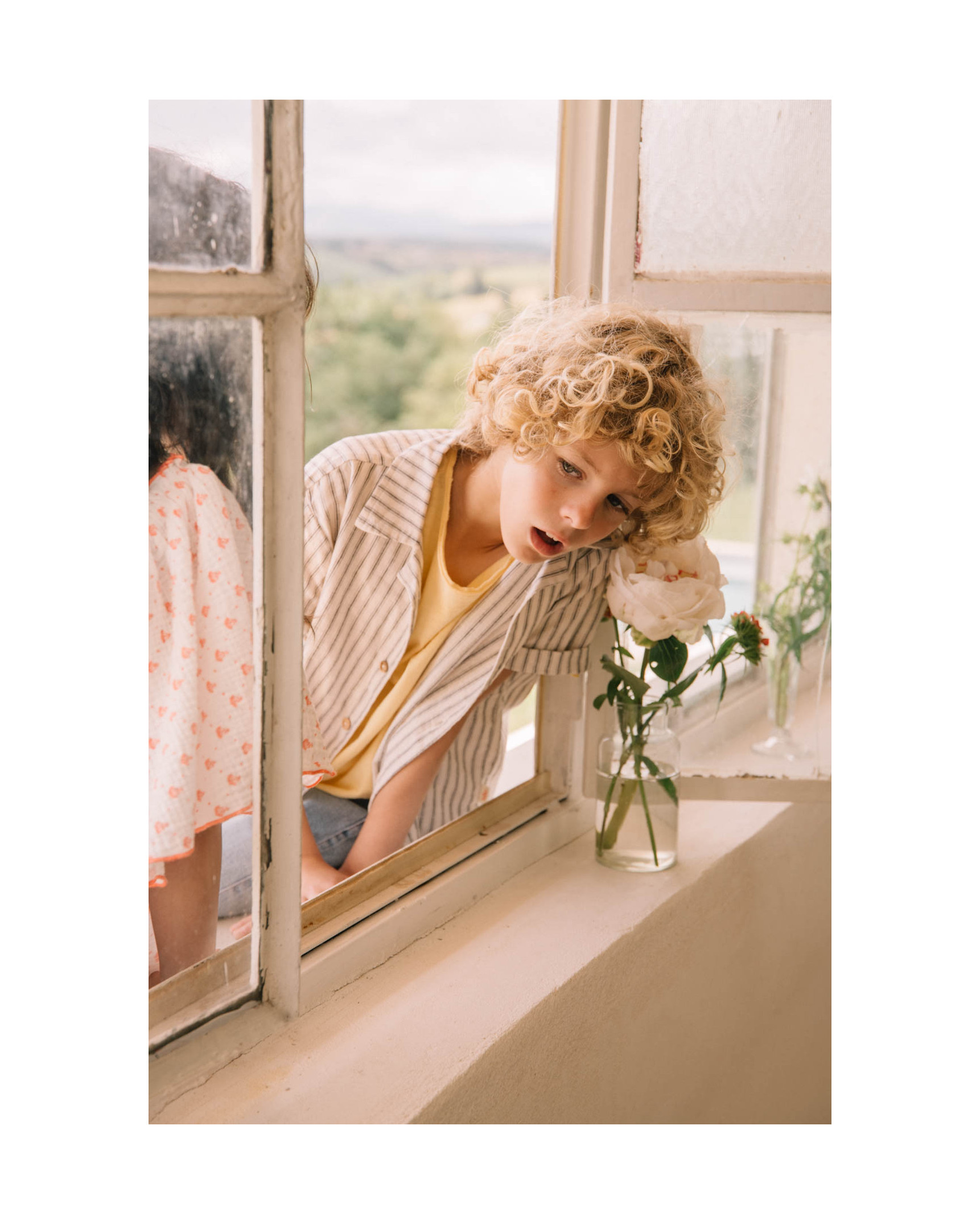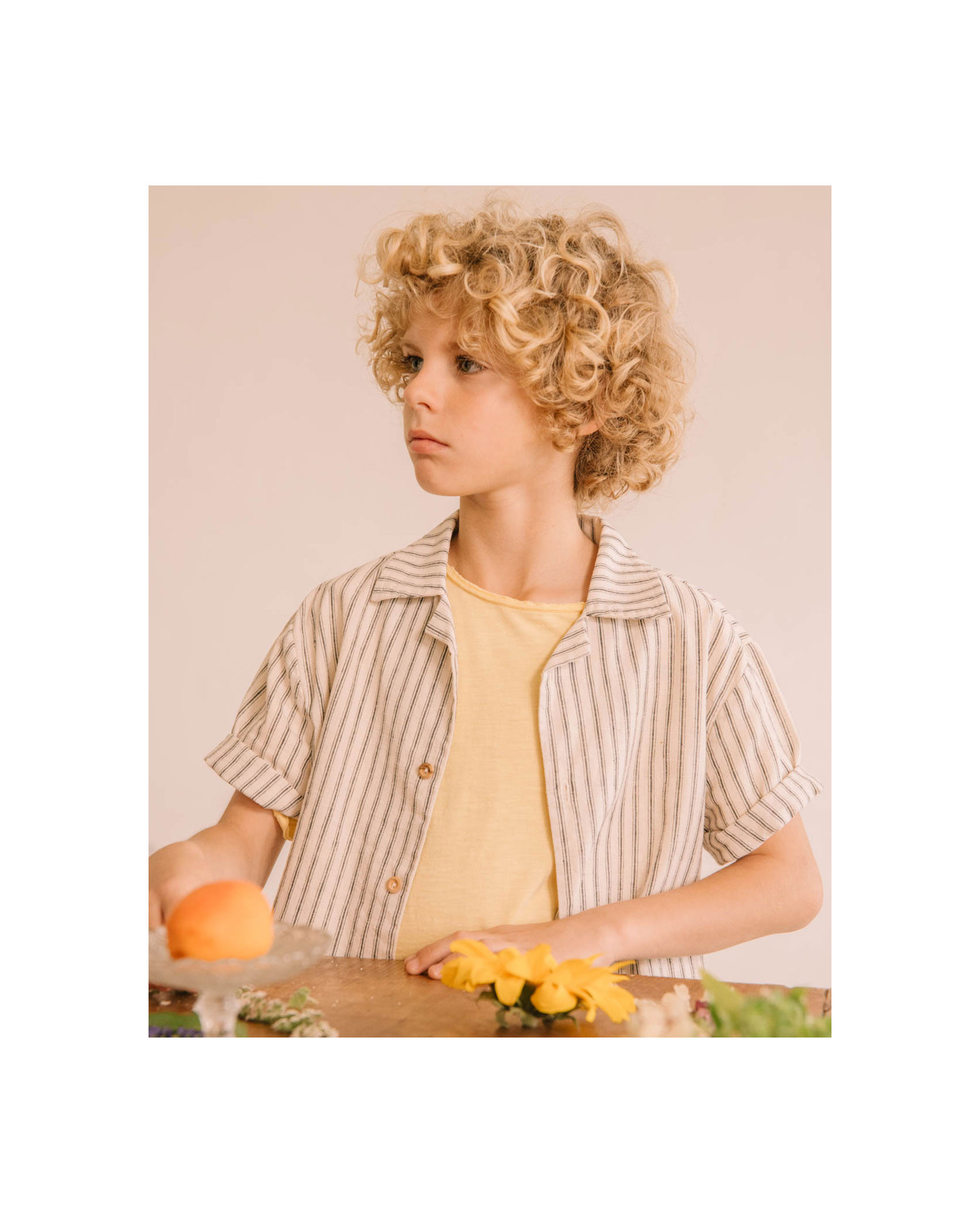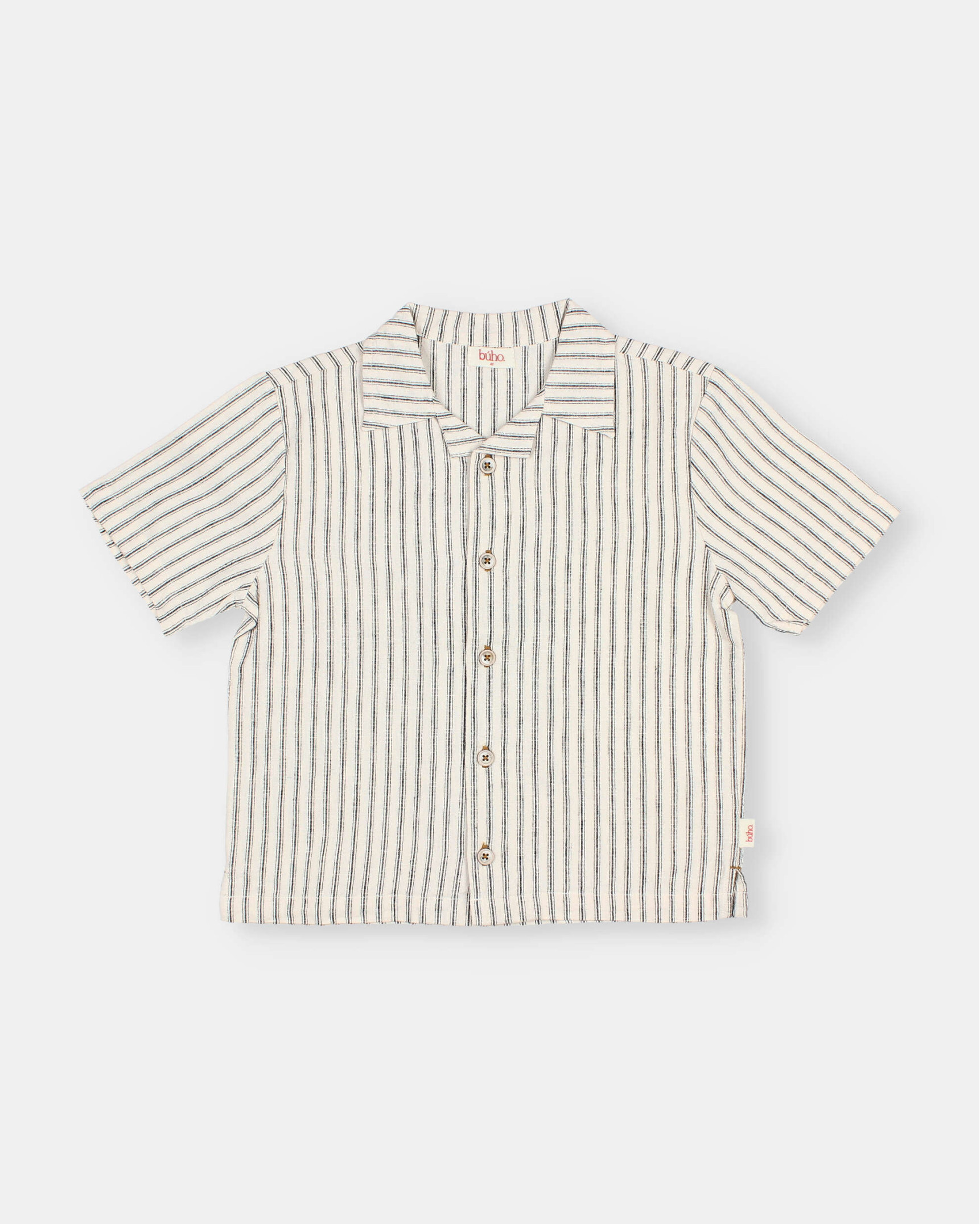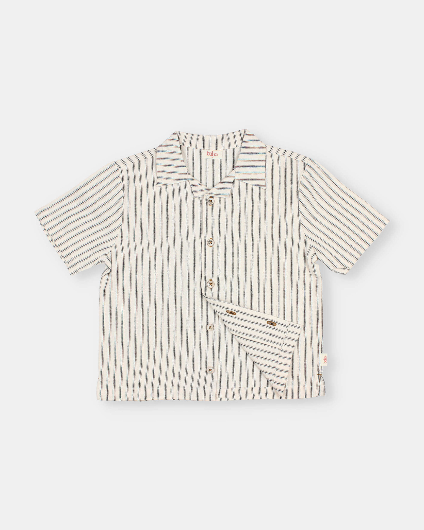 Long-sleeved cotton seersucker shirt with striped print. Mao collar. Button fastening on chest with wooden buttons. Contrasting embroidered detail on the side of the hem.