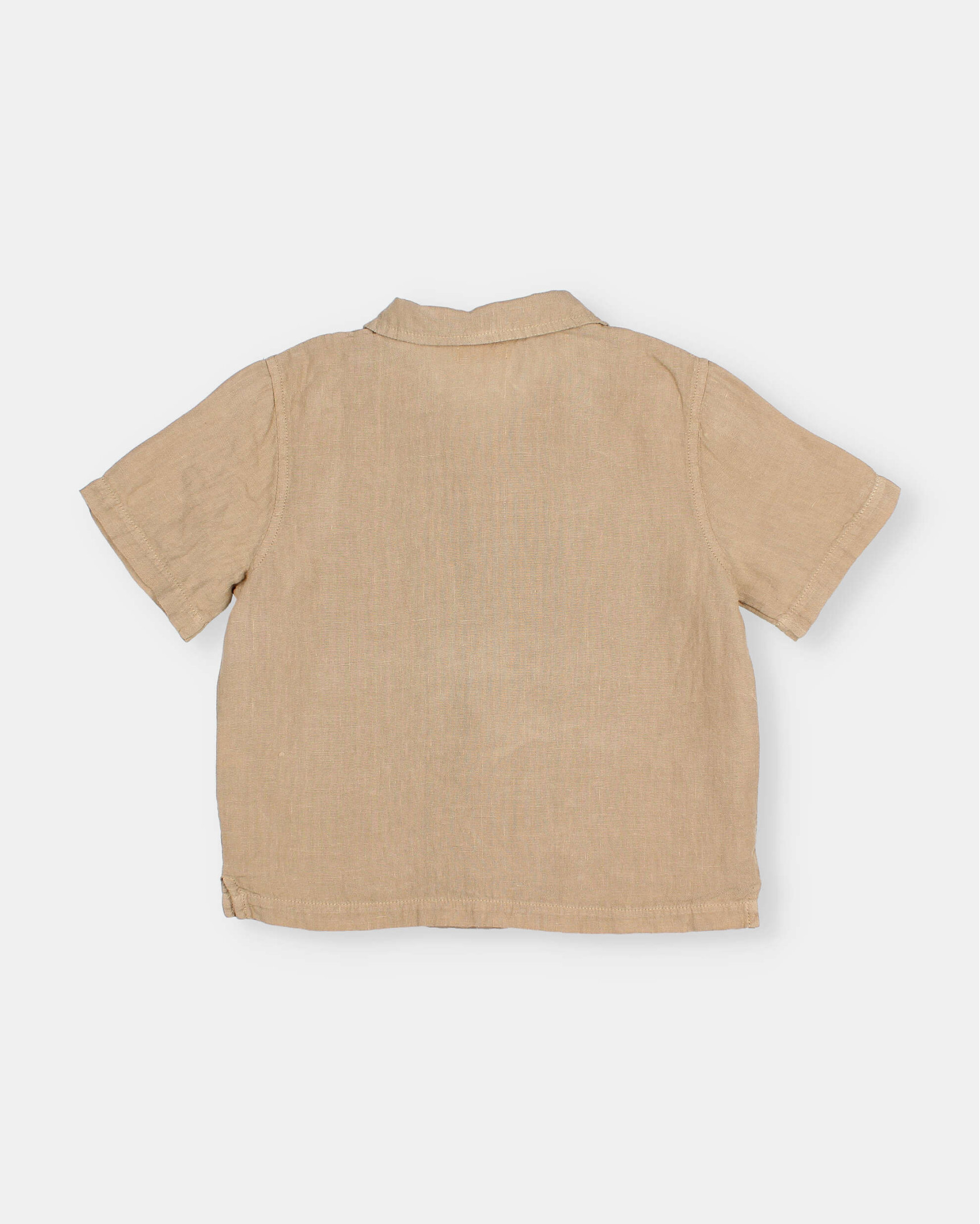 100% linen shirt with a soft washed effect and a relaxed feel. Short sleeves. Bowling collar and front button fastening. Tone-on-tone embroidered detail on the chest.