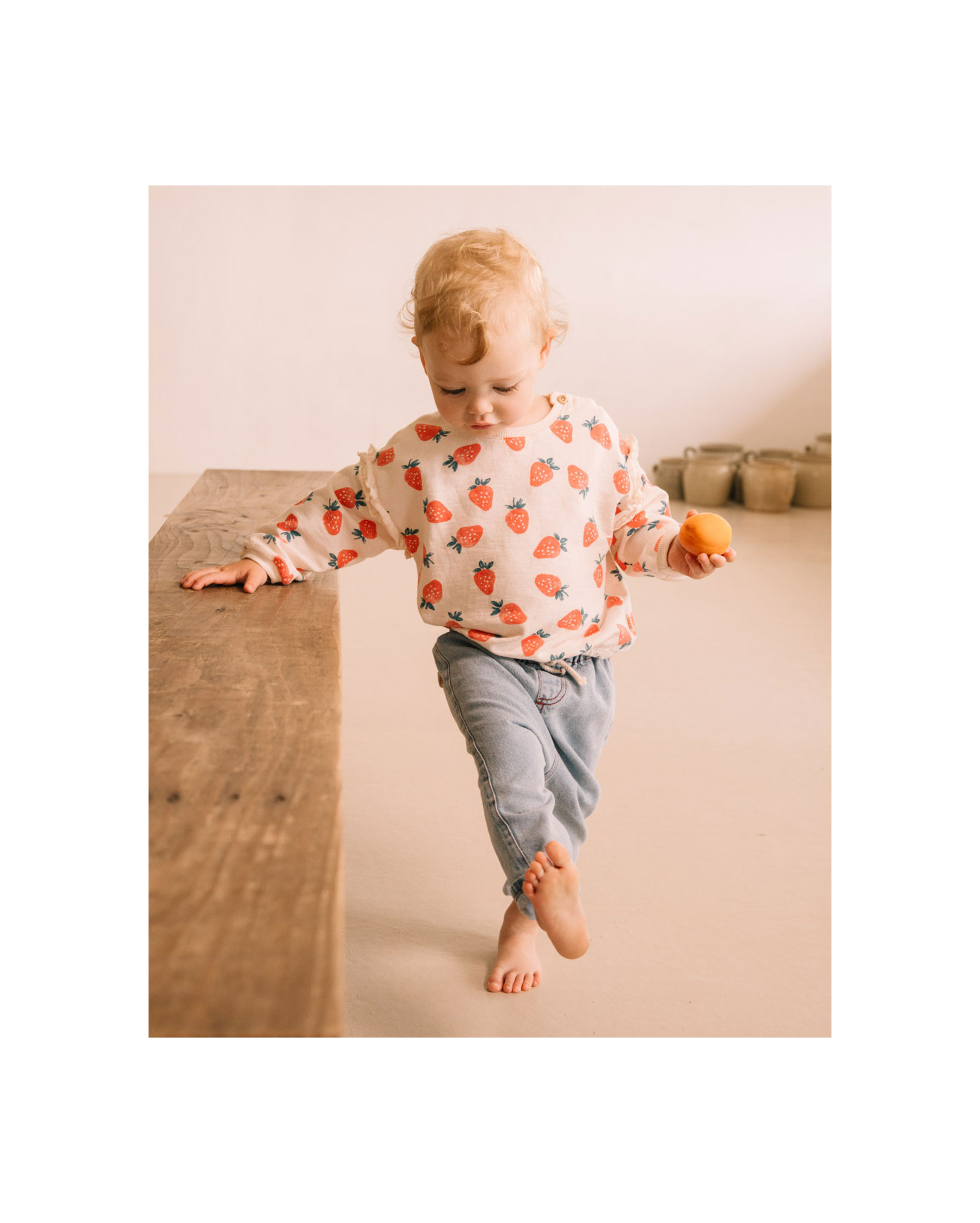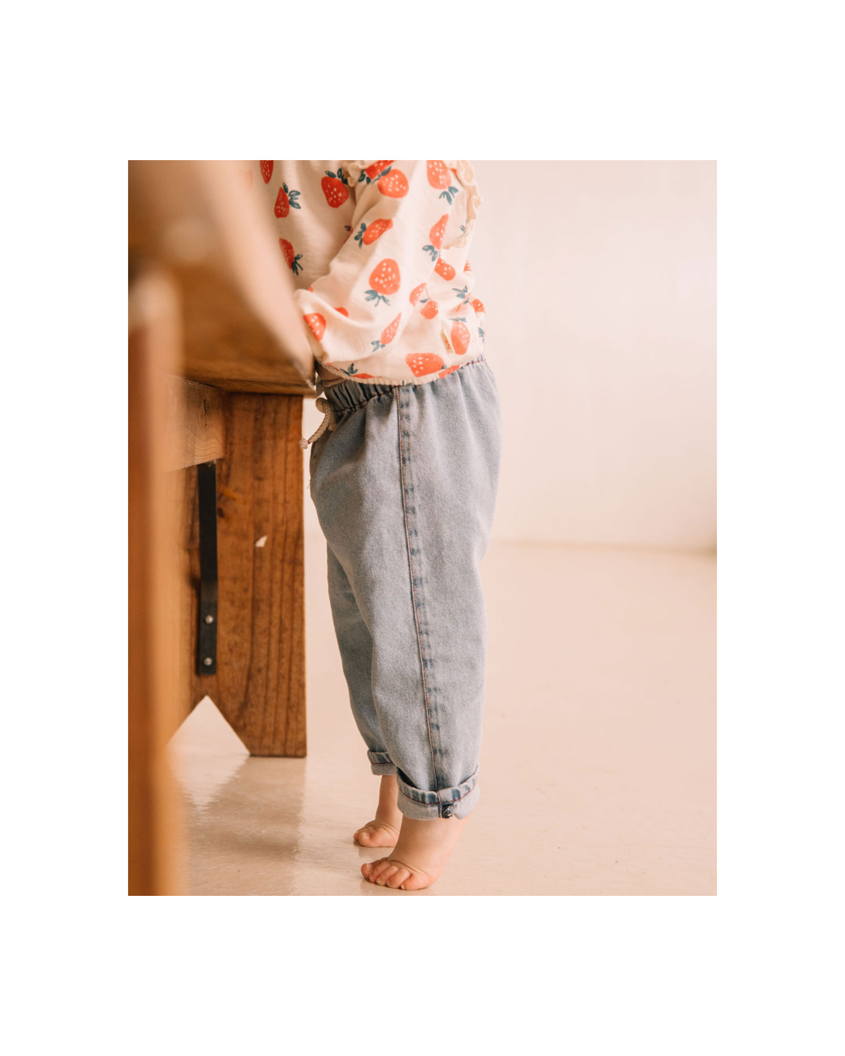 Light wash denim pants. Elastic waistband with decorative raw cotton drawstring. Patch pocket on the back. Contrast stitching and topstitching details.