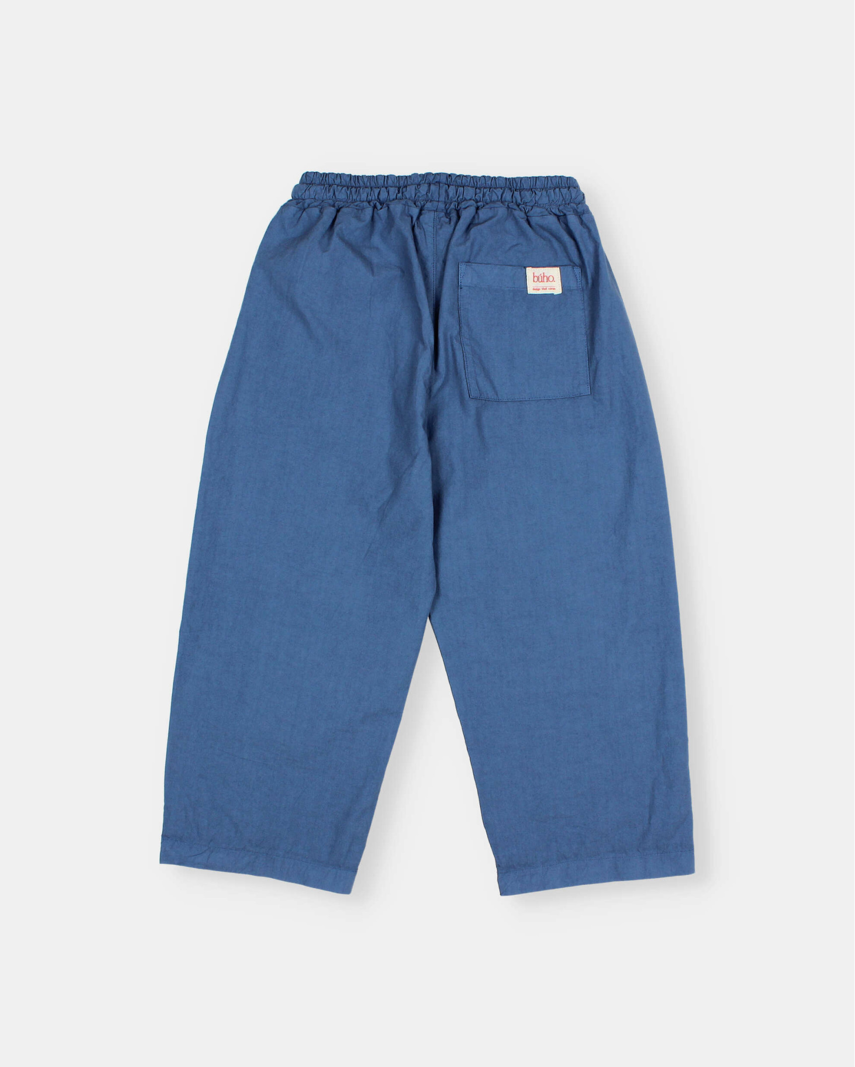 Long poplin pants in organic cotton. Elastic waistband with ribbon for a better fit. Front pockets. Plastron-style pocket on the back with decorative label.