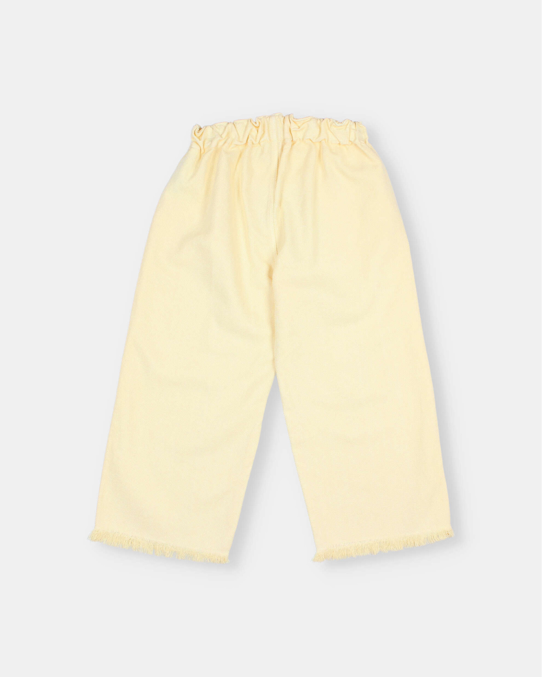 Long drill pants. Elastic waistband with cotton ribbon inside for a better fit. Decorative button at the front. Plastron-style front pockets. Frayed hem. Contrasting stitching.