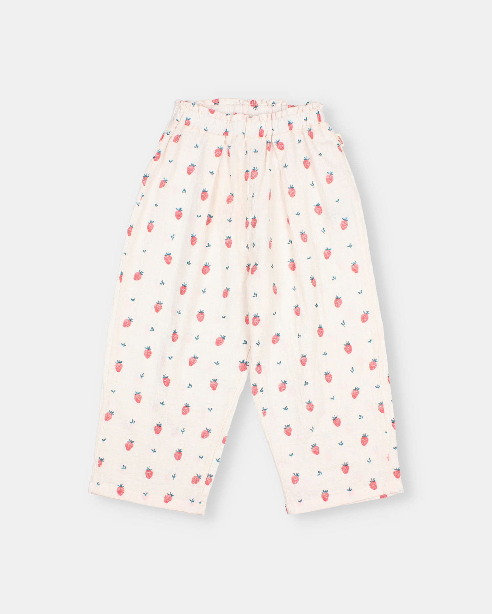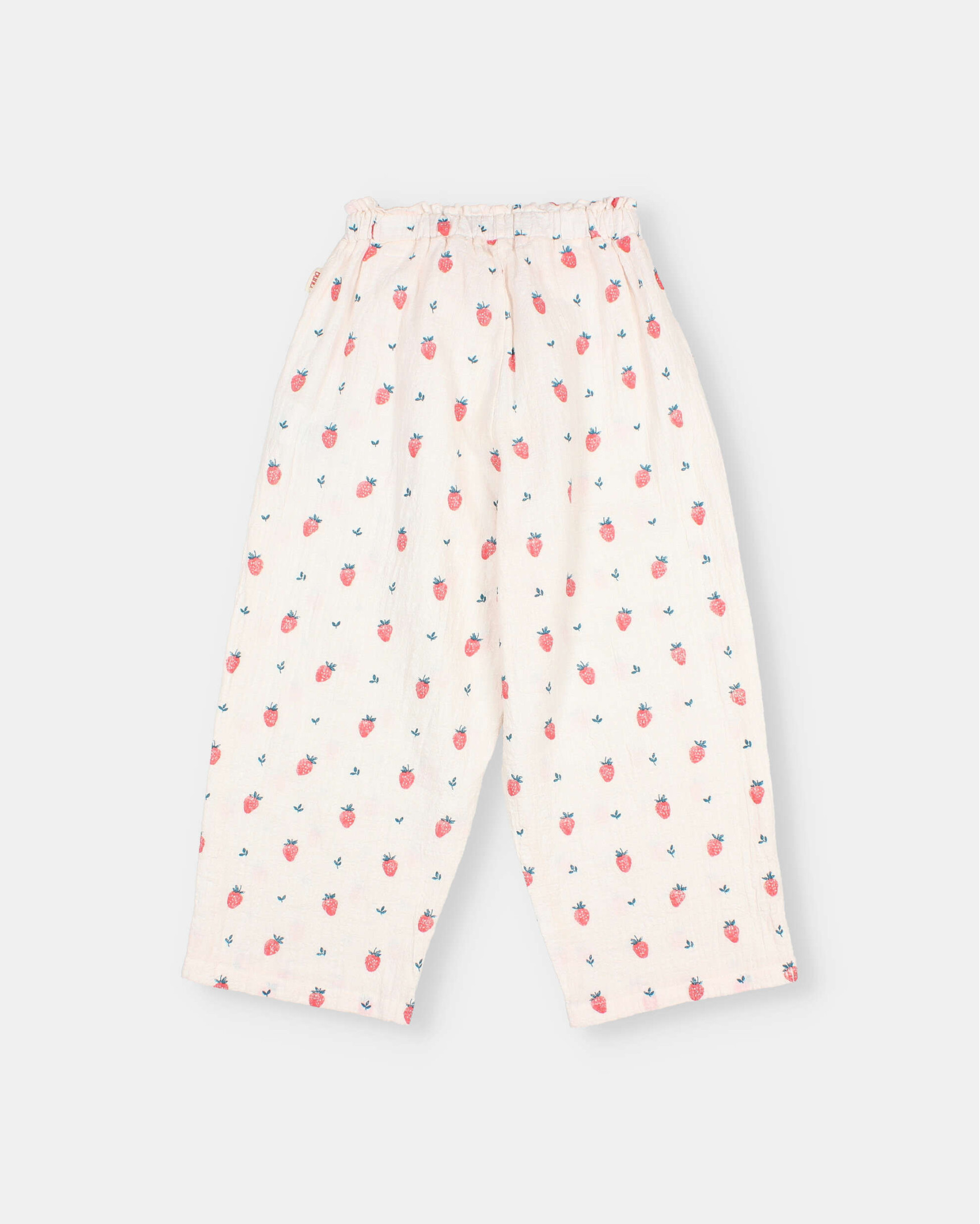 Long, wide-leg pants in textured organic cotton with a strawberry print. Elastic waistband with a small ruffle.