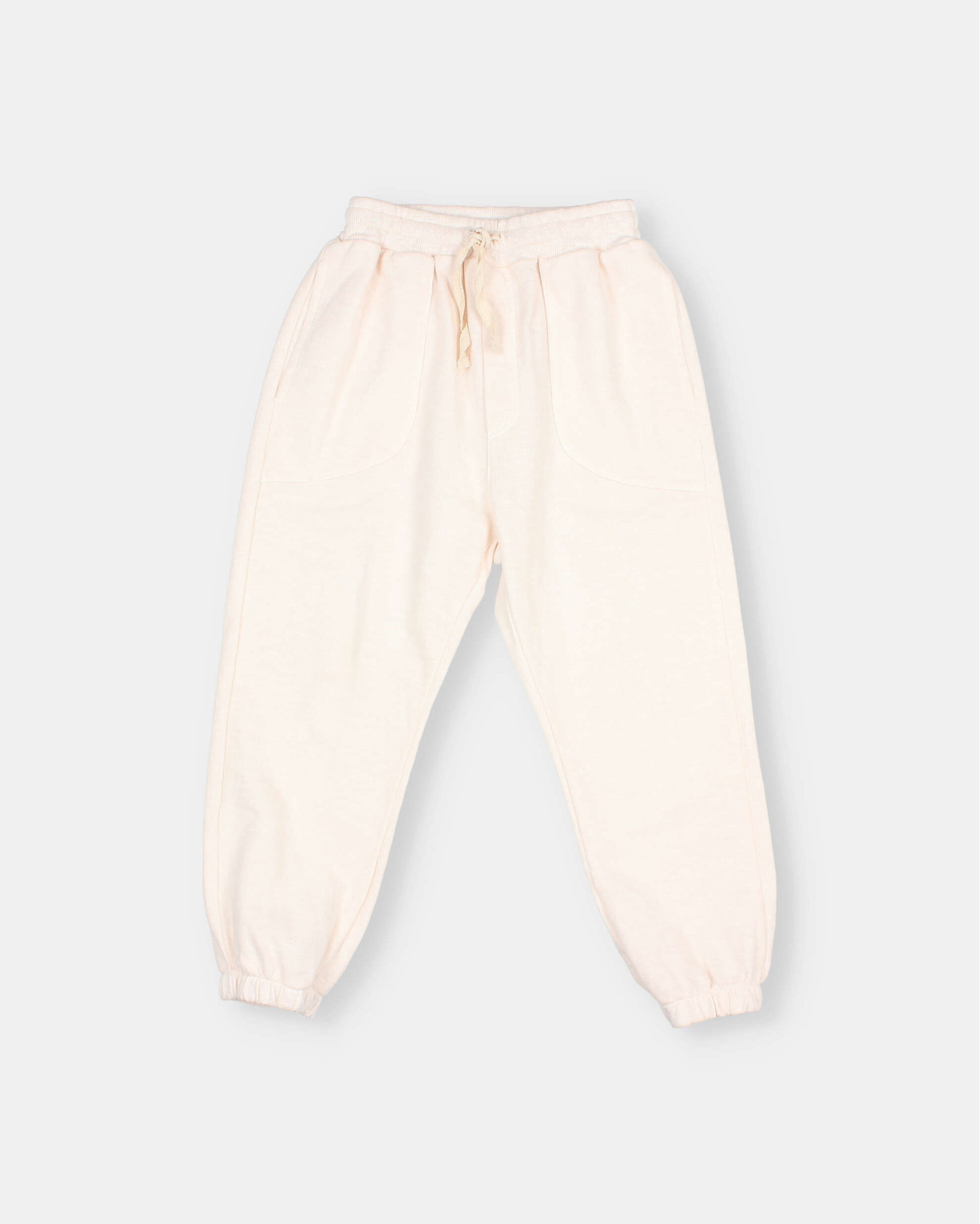 Soft fleece jogging pants in organic cotton. Elastic ribbed waistband with raw cotton ribbon for adjustment. Front and back patch pockets. Fitted ankles.