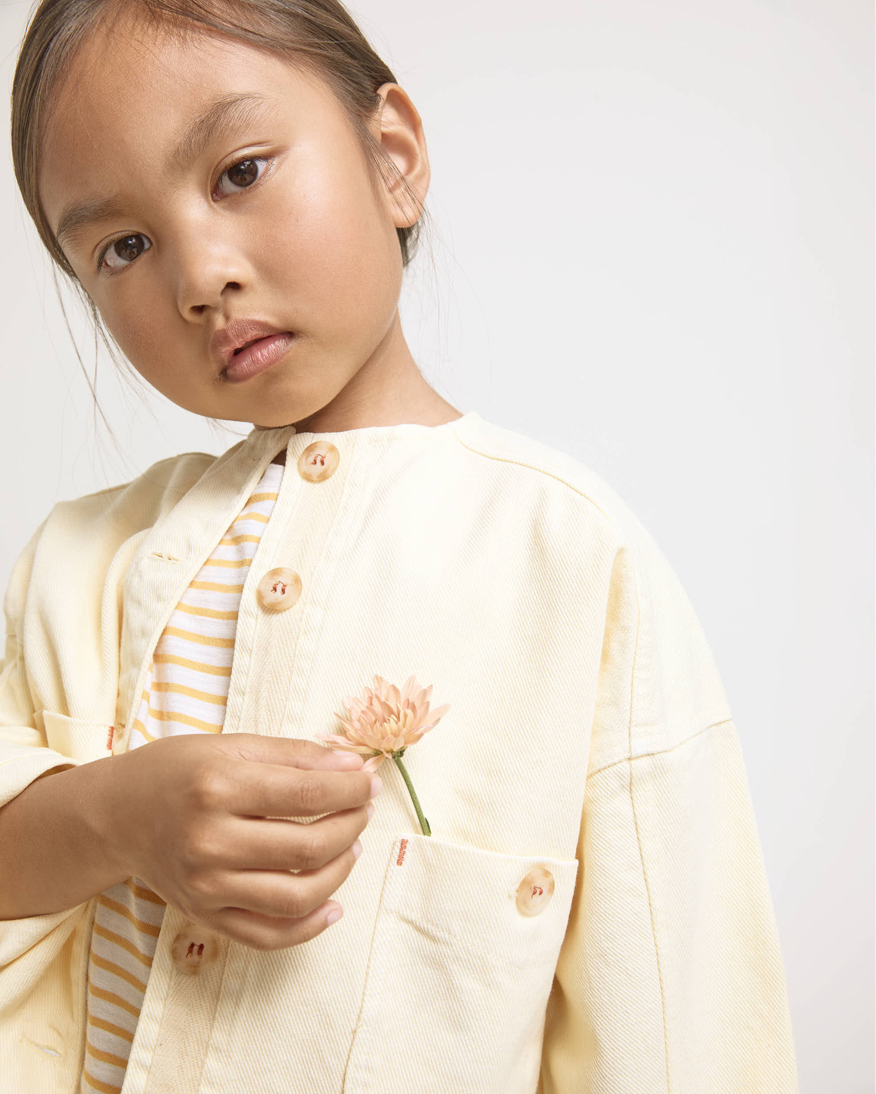 Chaqueta corta de sarga. Cuello redondo y abotonado delantero. Bolsillos frontales tipo plastrón. Atacados a contraste.