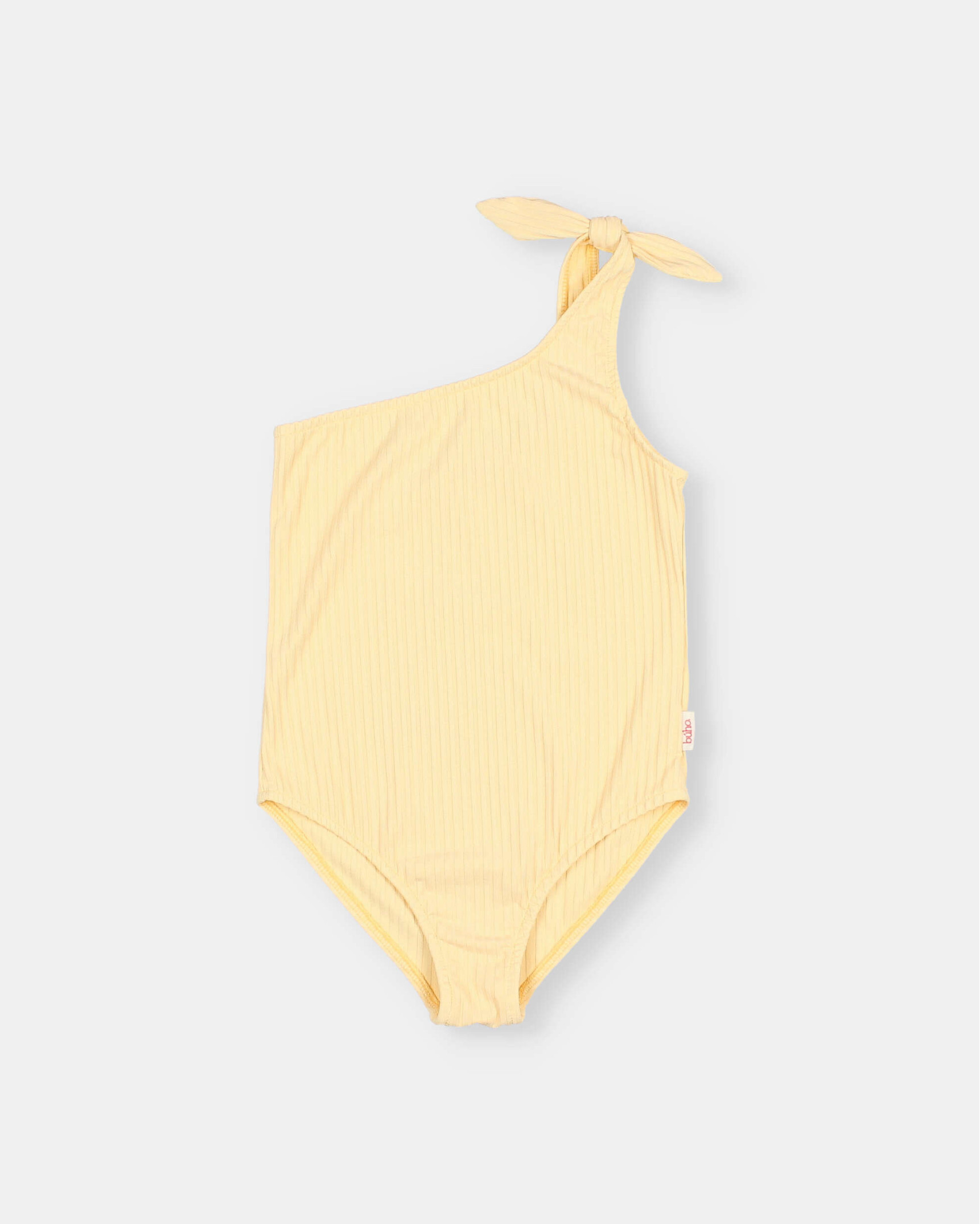 Maillot de poliamida acanalada con escote asimétrico con tirante y lazada de adorno.