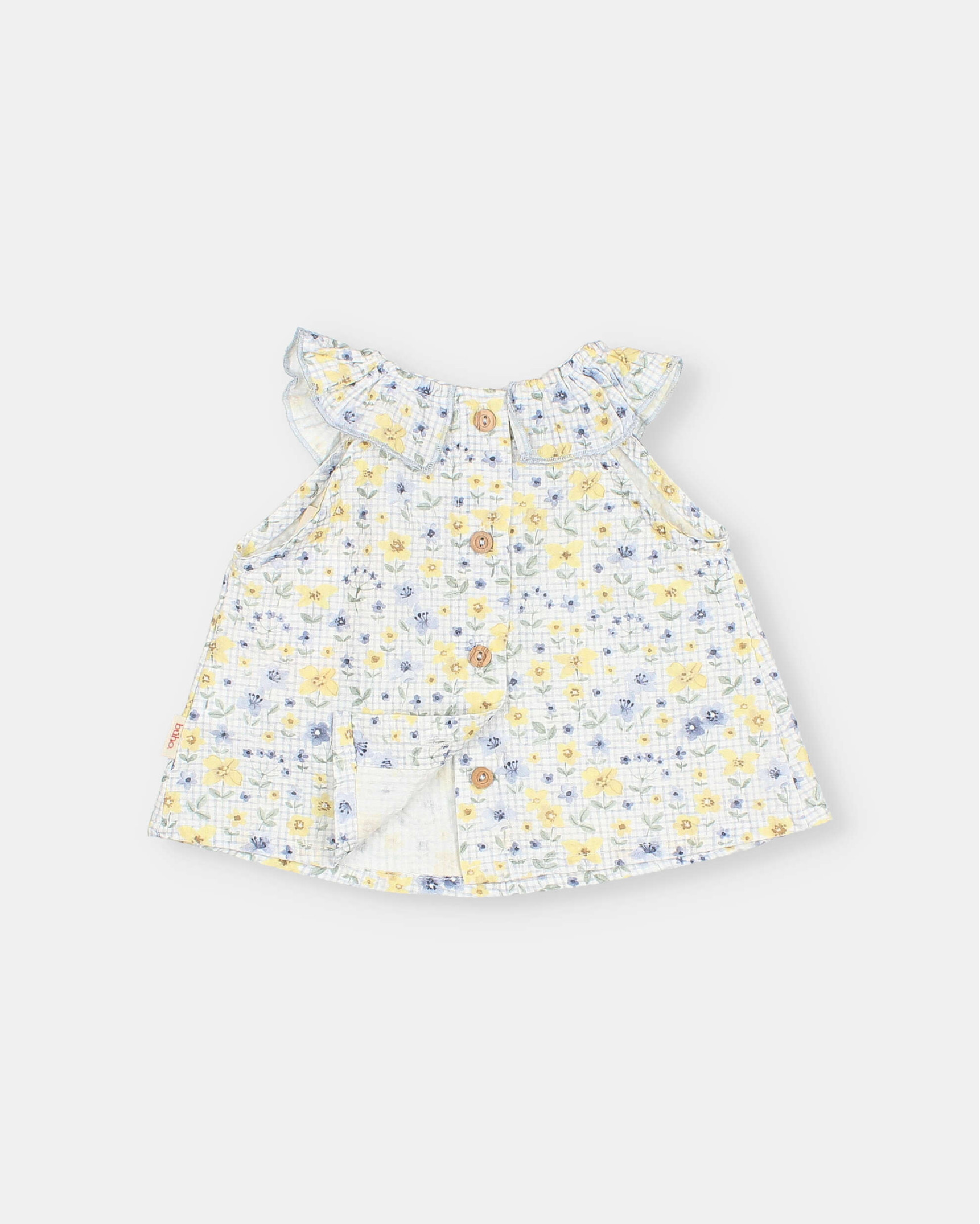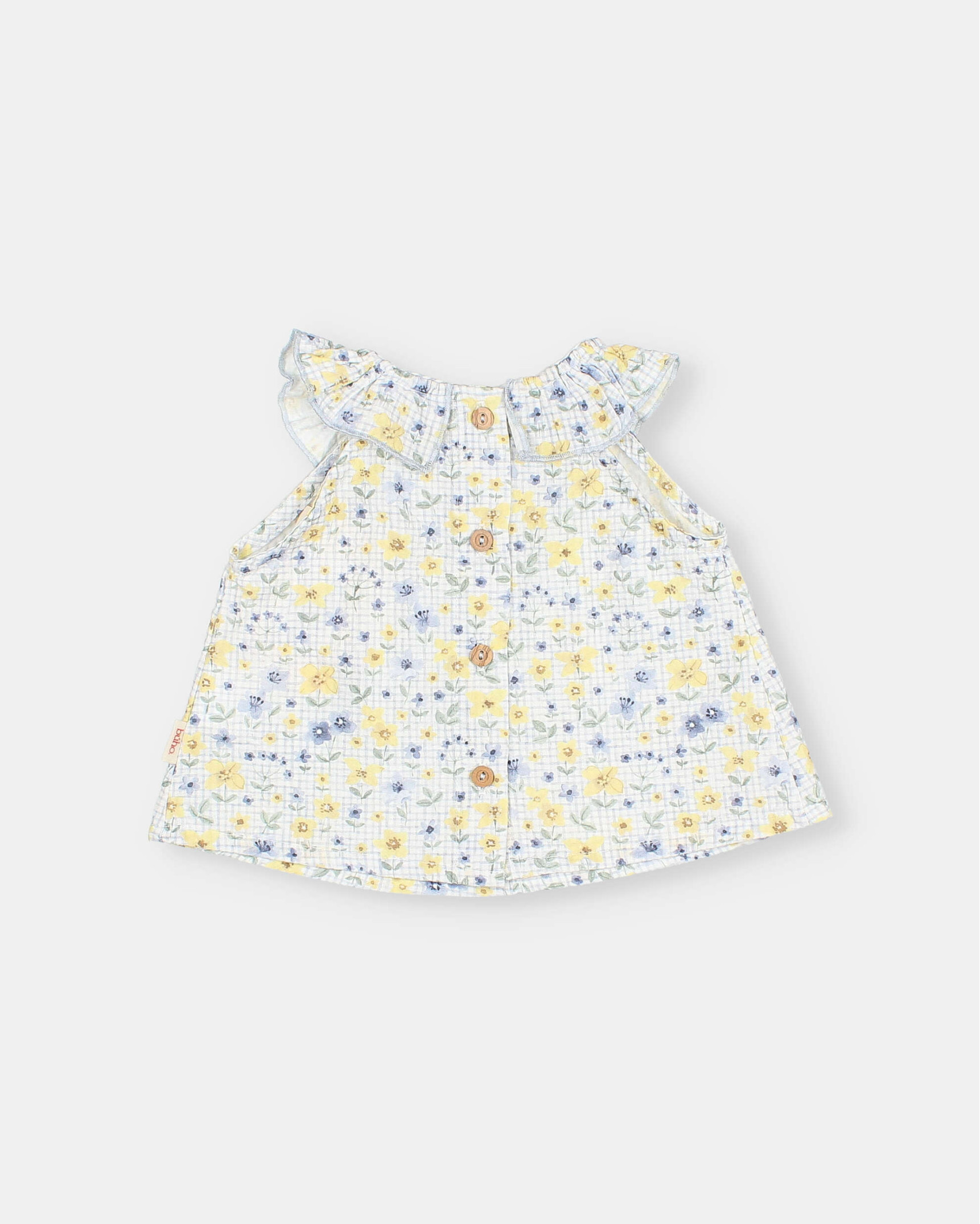 Blusa sin mangas en seersucker de algodón con estampado picnic. Cuello redondo con volante con acabado repulgo a contraste. Abrochado mediante botones de madera en la espalda.