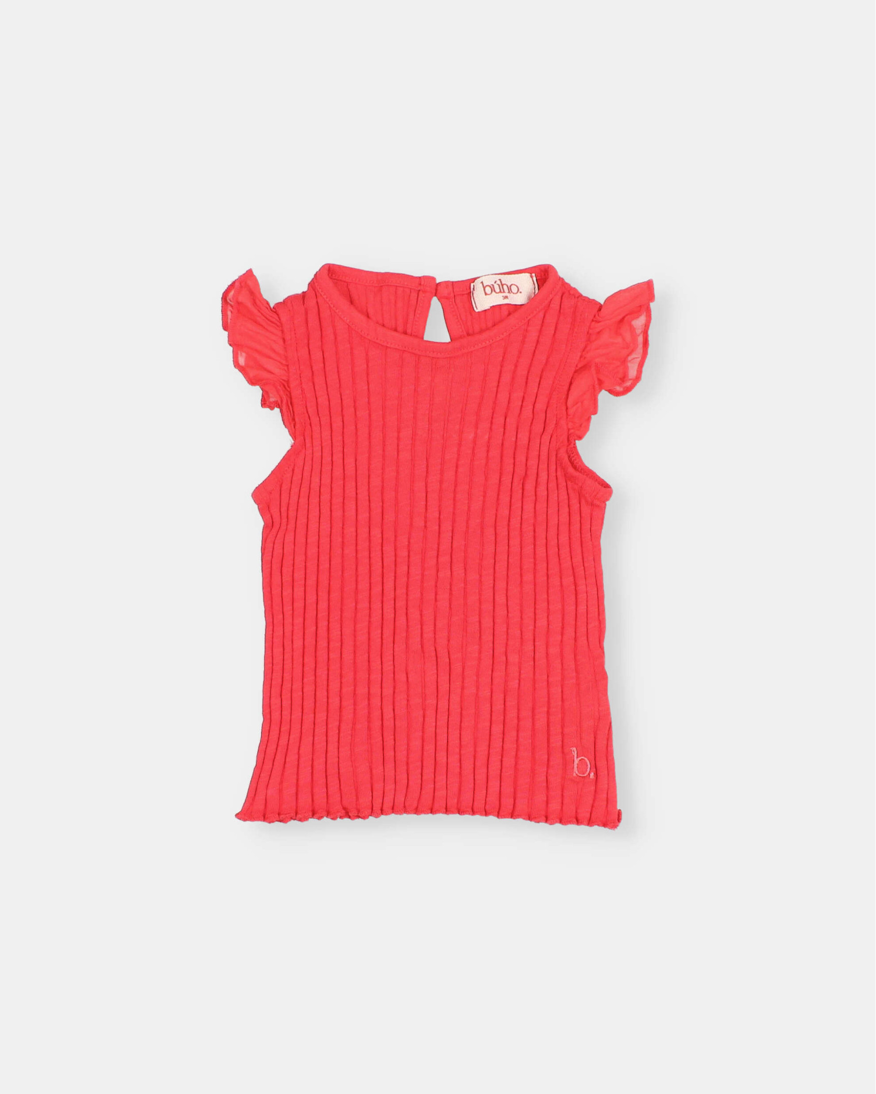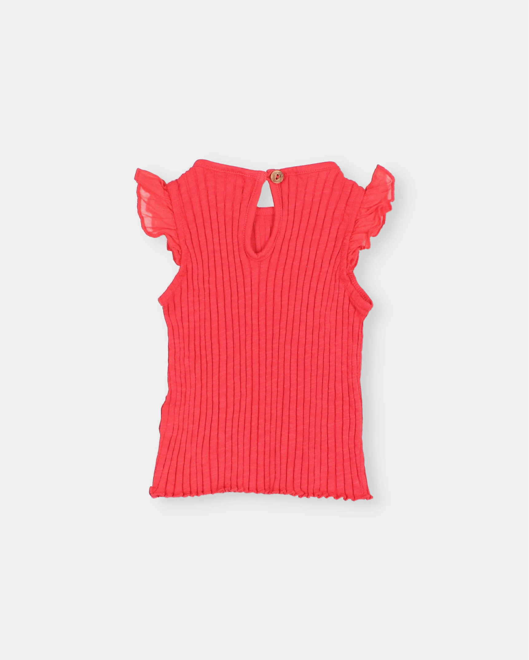 Camiseta de tirantes de canalé ancho en algodón orgánico. Cuello redondo con apertura tipo lágrima con botón de madera en la espalda. Volante de voile de algodón en los hombros. Bordado decorativo a contraste.