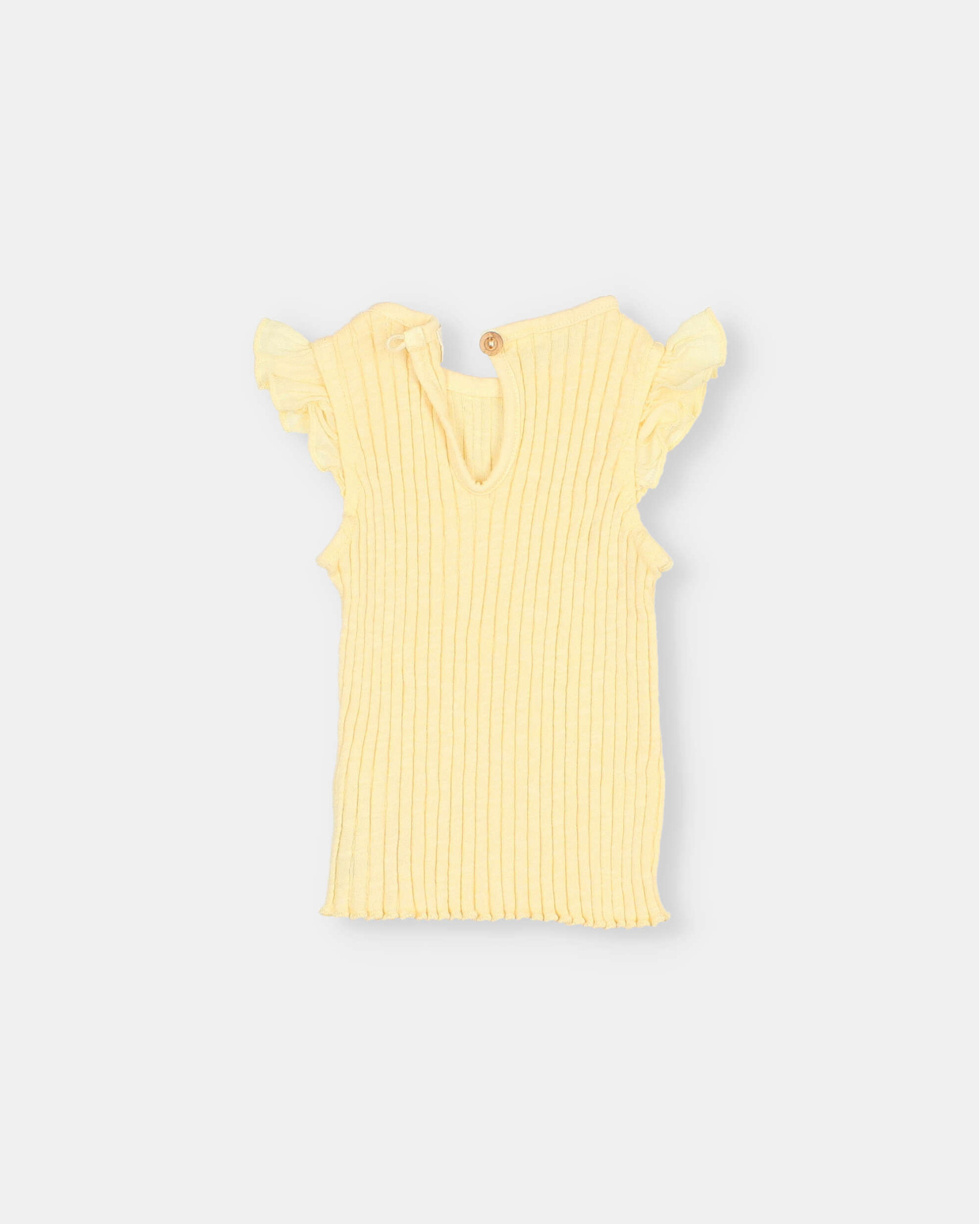 Camiseta de tirantes de canalé ancho en algodón orgánico. Cuello redondo con apertura tipo lágrima con botón de madera en la espalda. Volante de voile de algodón en los hombros. Bordado decorativo a contraste.