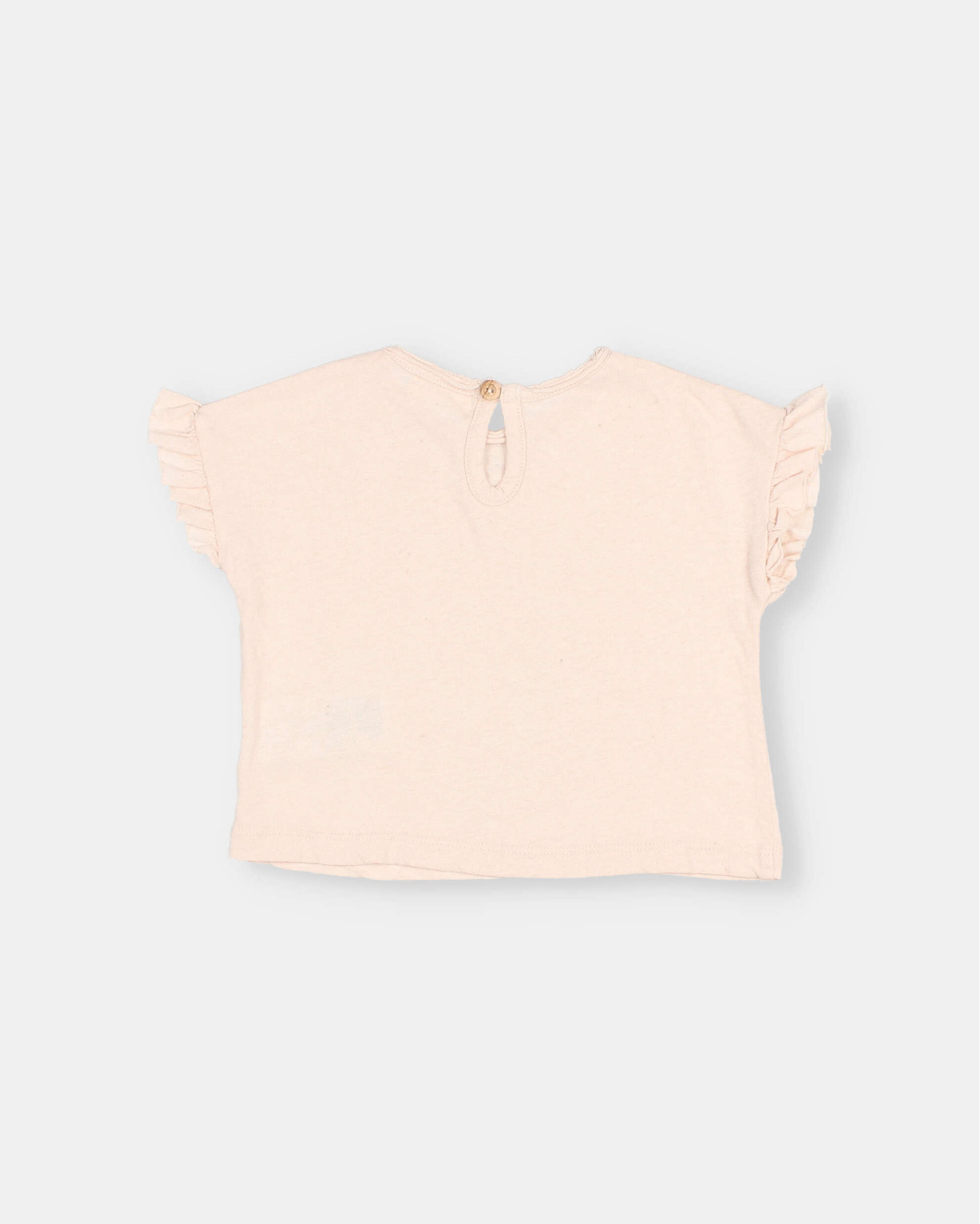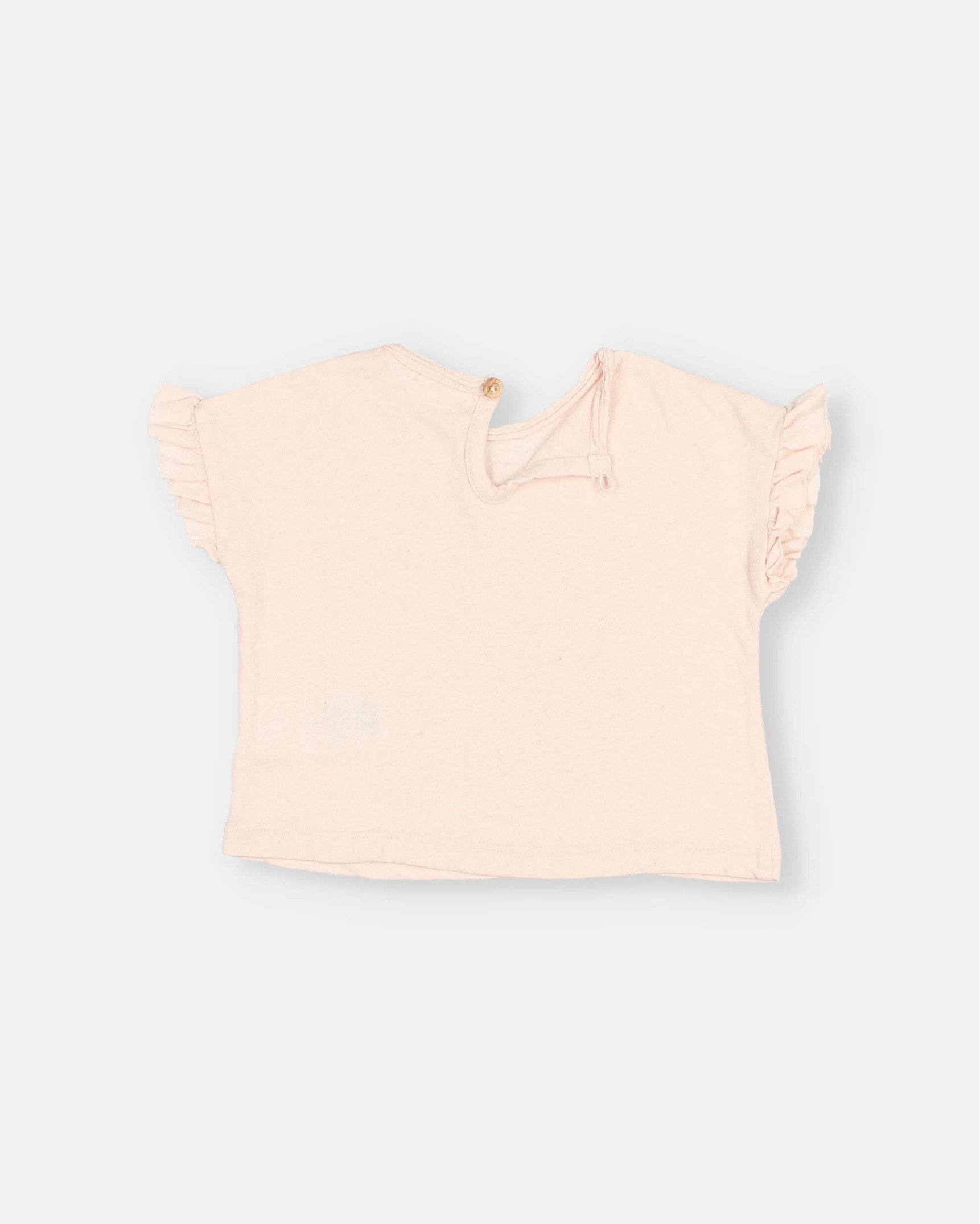 Camiseta de algodón de lino. Manga corta con volante. Cuello redondo con apertura tipo lágrima con botón de madera en la espalda.