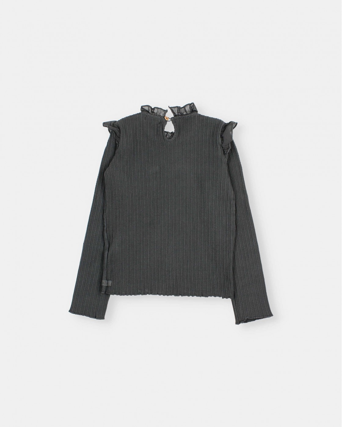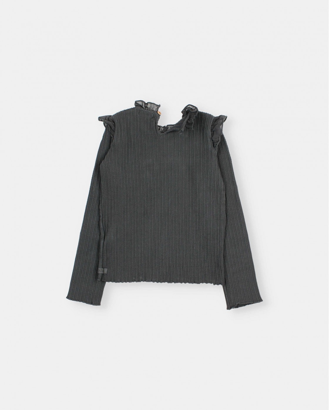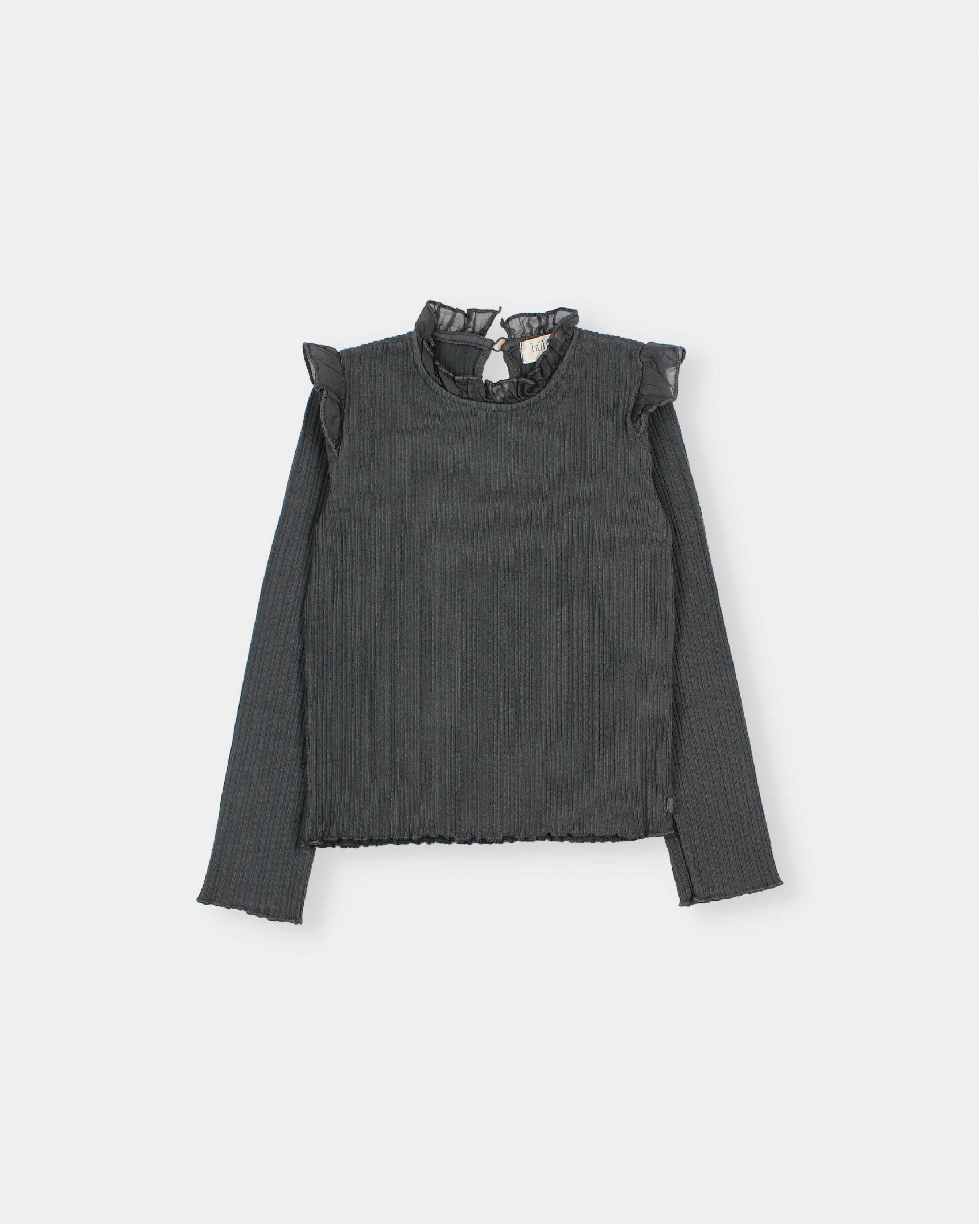 Camiseta de manga larga de canalé. Apertura tipo lágrima en la espalda. Volantes de voile en los hombros y cuello.