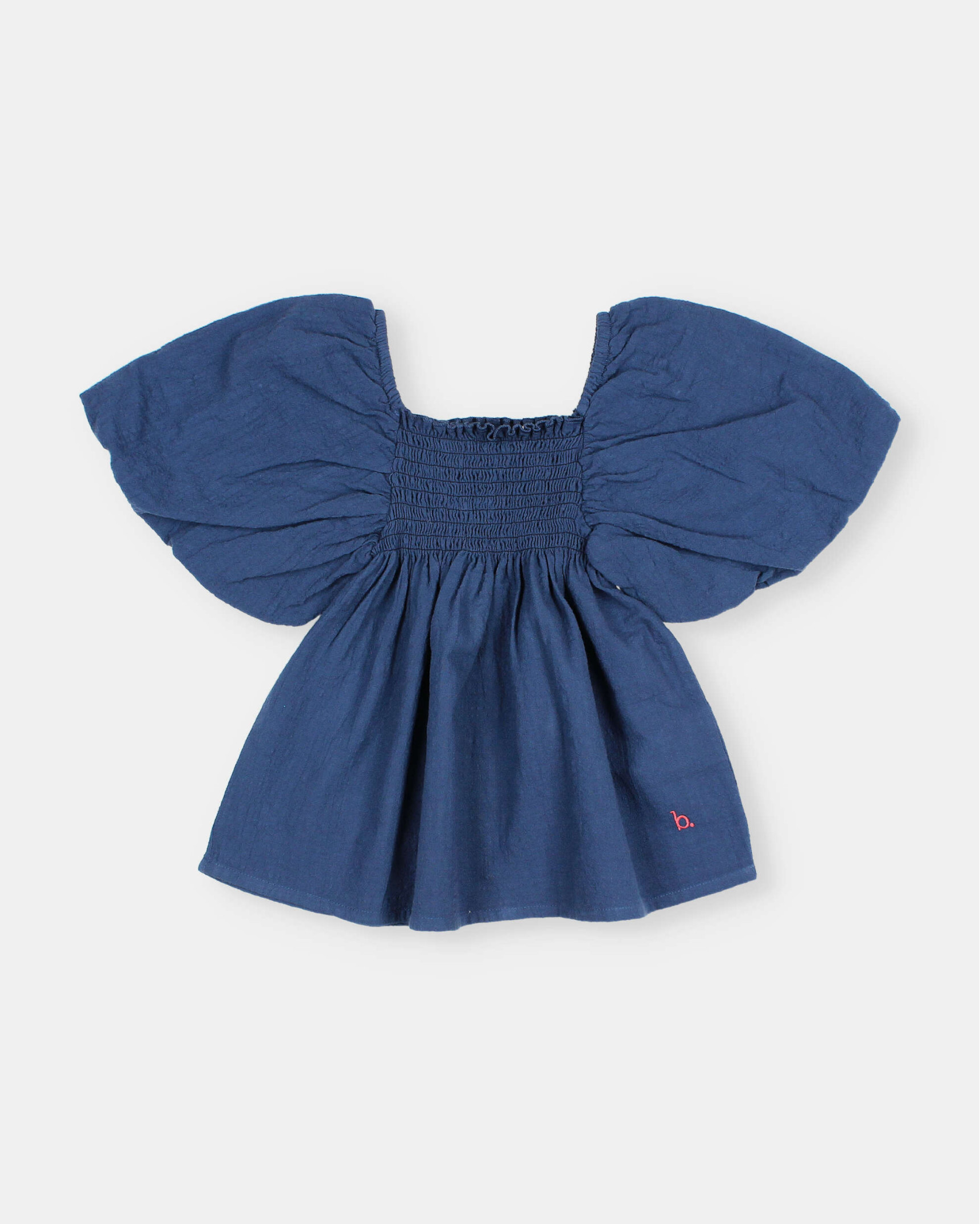 Top de algodón orgánico texturado. Mangas abullonadas. Escote recto con goma elástica. Bajo con volante y detalle bordado a contraste en el lateral.