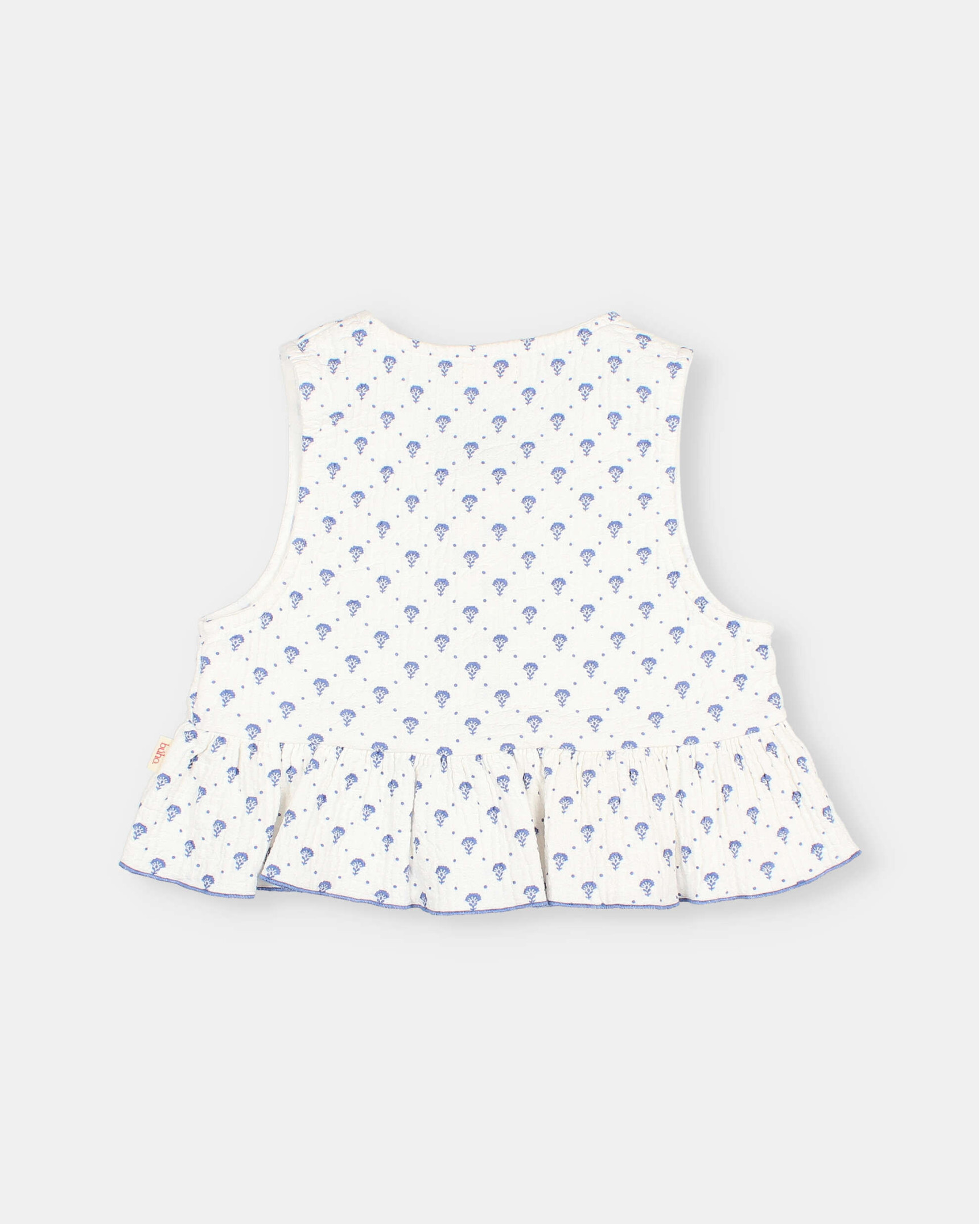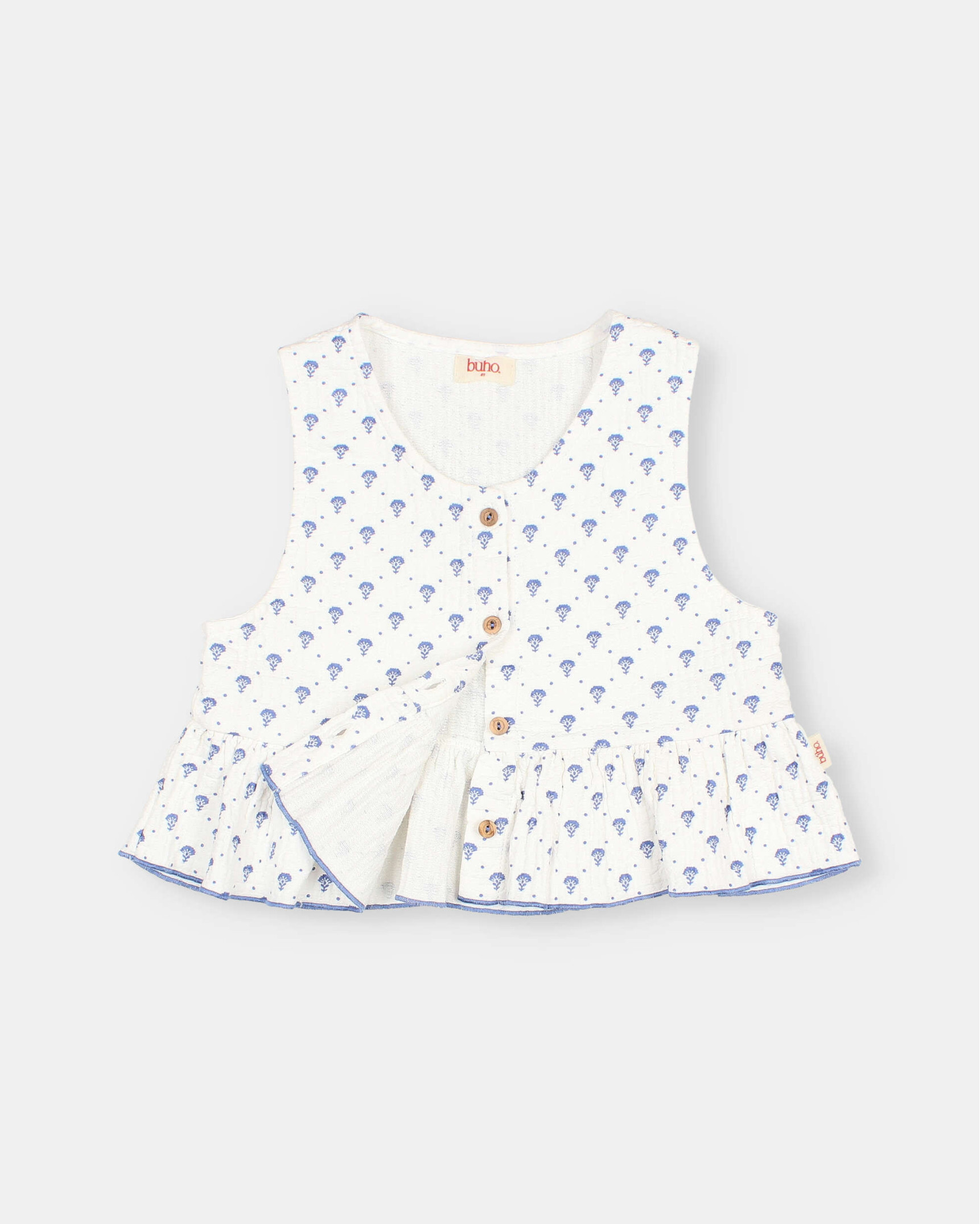 Top de tejido de algodón pespunteado con estampado bali. Volante en el bajo con acabado repulgo a contraste. Escote redondo. Abotonado frontal con botones de madera.