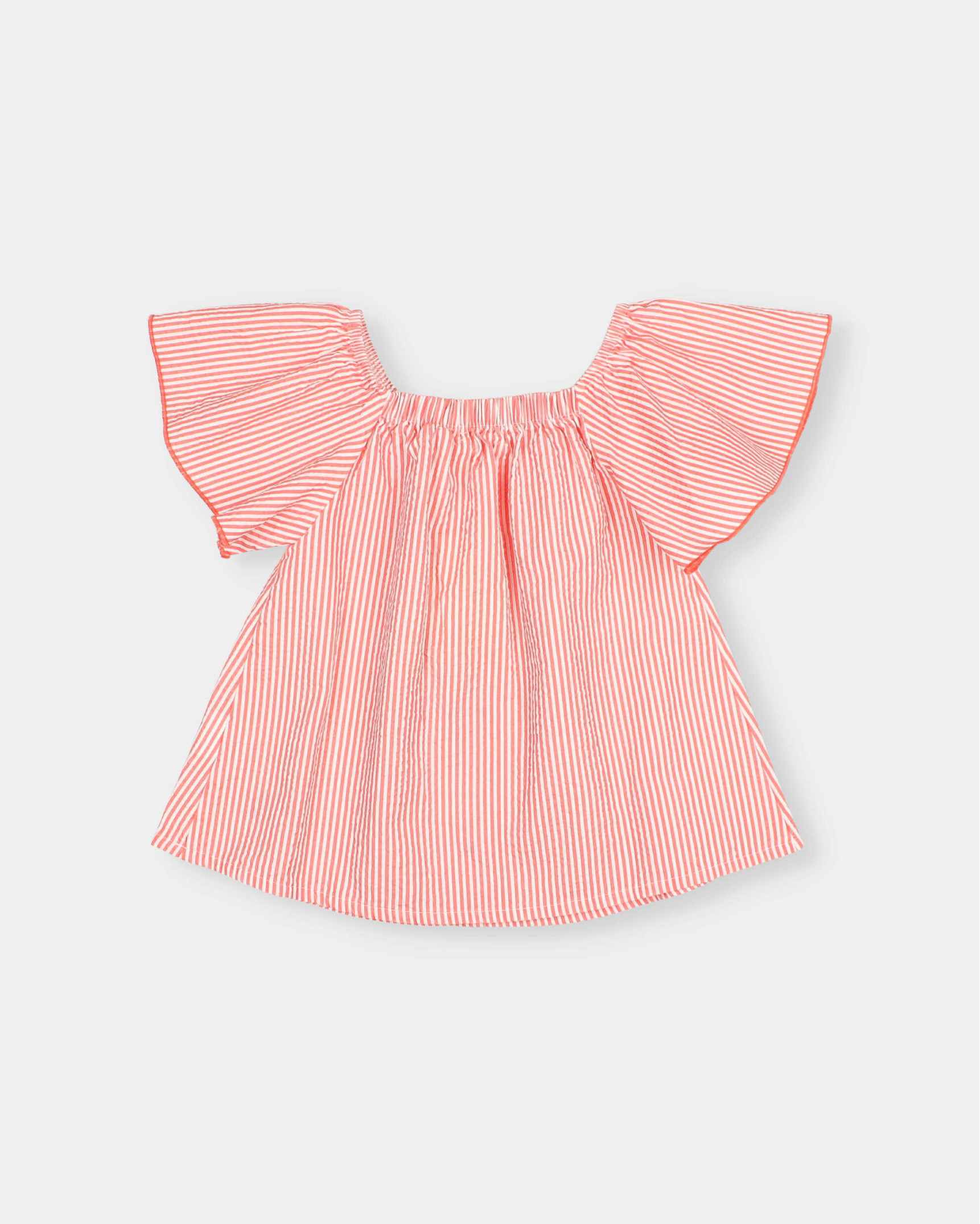 Blusa en seersucker de algodón con estampado a rayas. Escote recto con goma. Mangas anchas con volante con acabado repulgo a contraste. Abotonado frontal con botones de madera. Detalle bordado a contraste en el lateral del bajo.