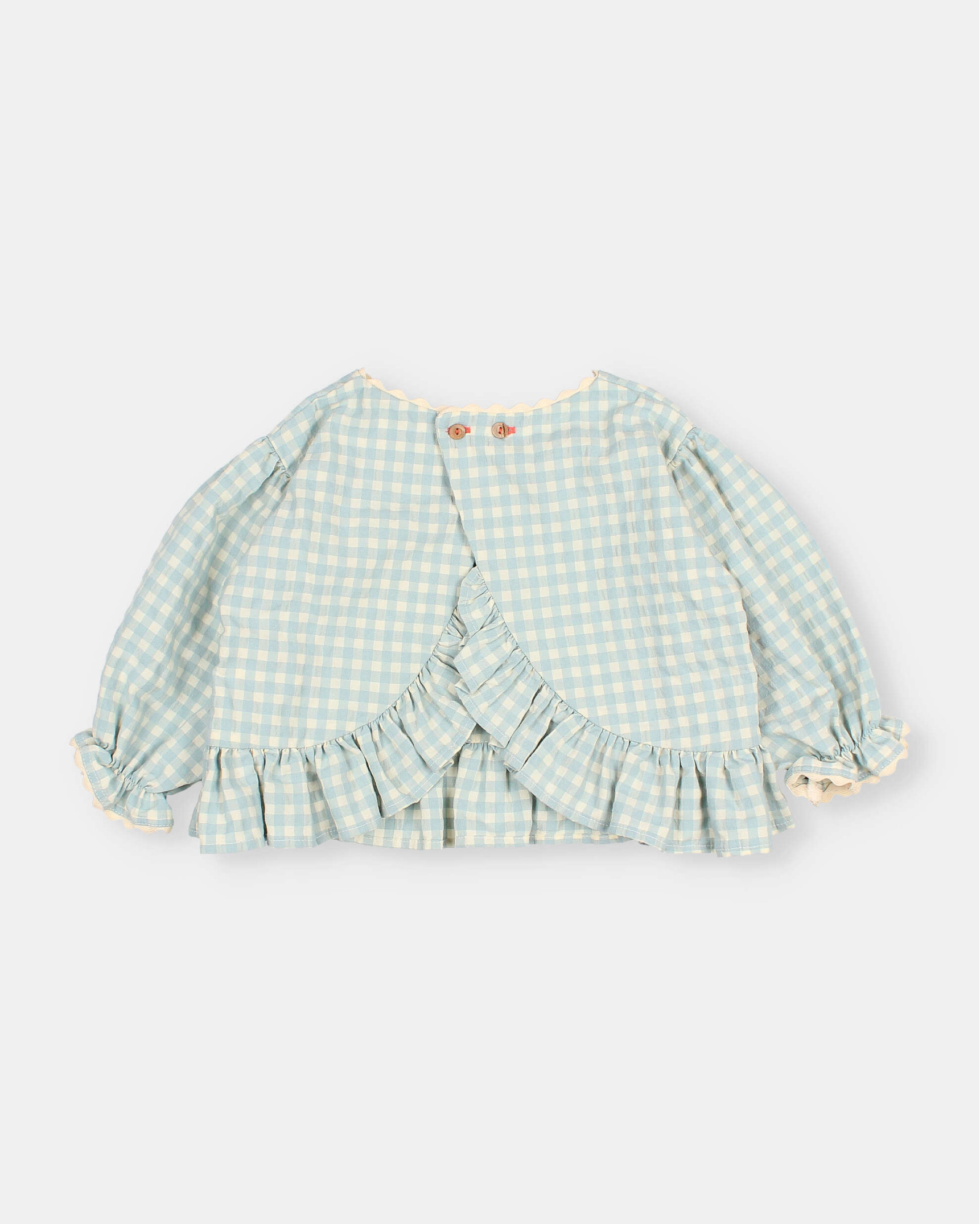 Blusa de cuadro vichy en seersucker de algodón. Cuello redondo con detalle puntilla ondulina. Botones de madera para cierre en la espalda. Manga 3/4 con acabado en goma y volantito con puntilla ondulina. Espalda cruzada con volantes. Detalles de bordado y ojales con hilo a contraste.