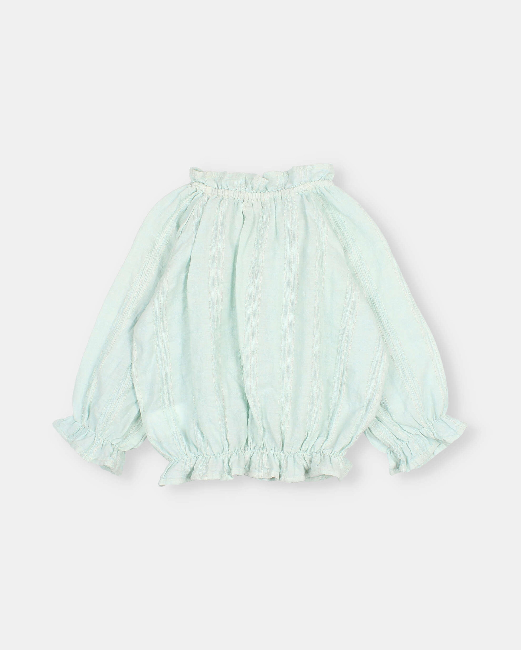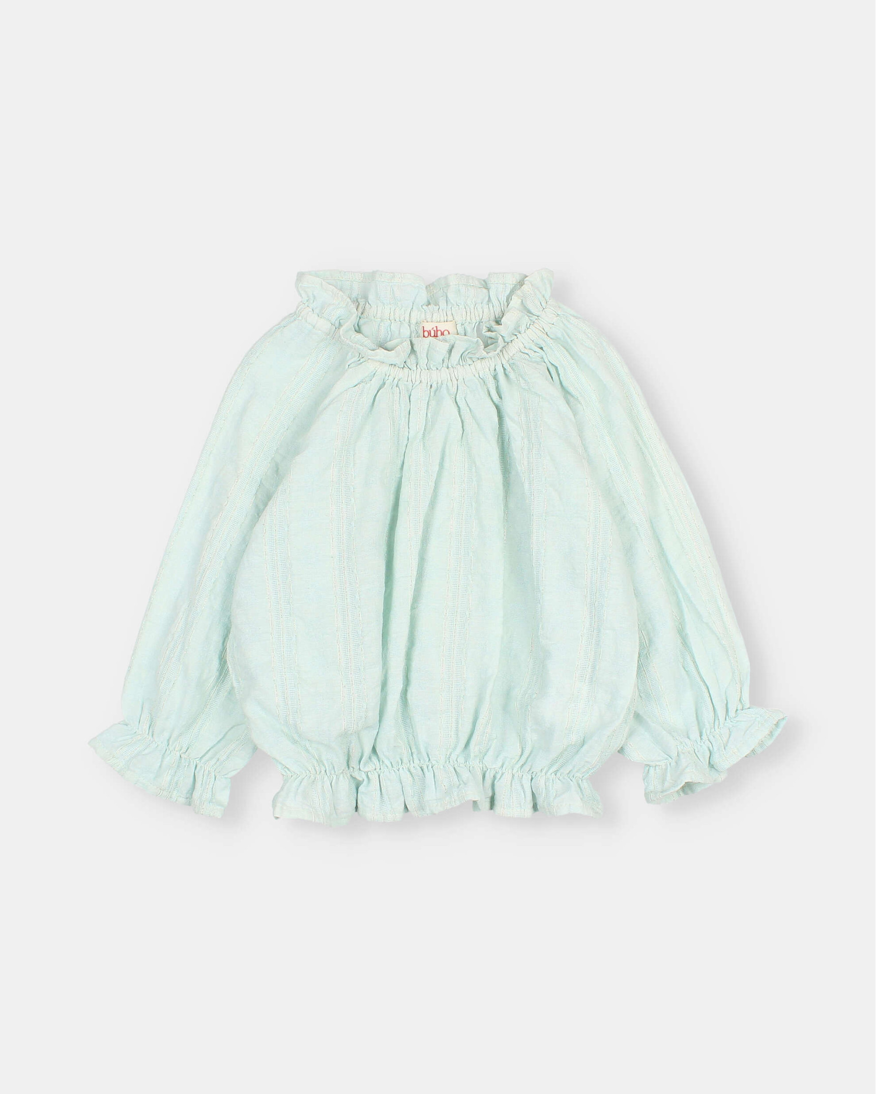 Blusa de voile de algodón con jacquard y delicadas rayas de lurex. Mangas 3/4 con acabado en goma. Bajo ajustado con goma. Acabados en cuello, bajo y puños con volante.