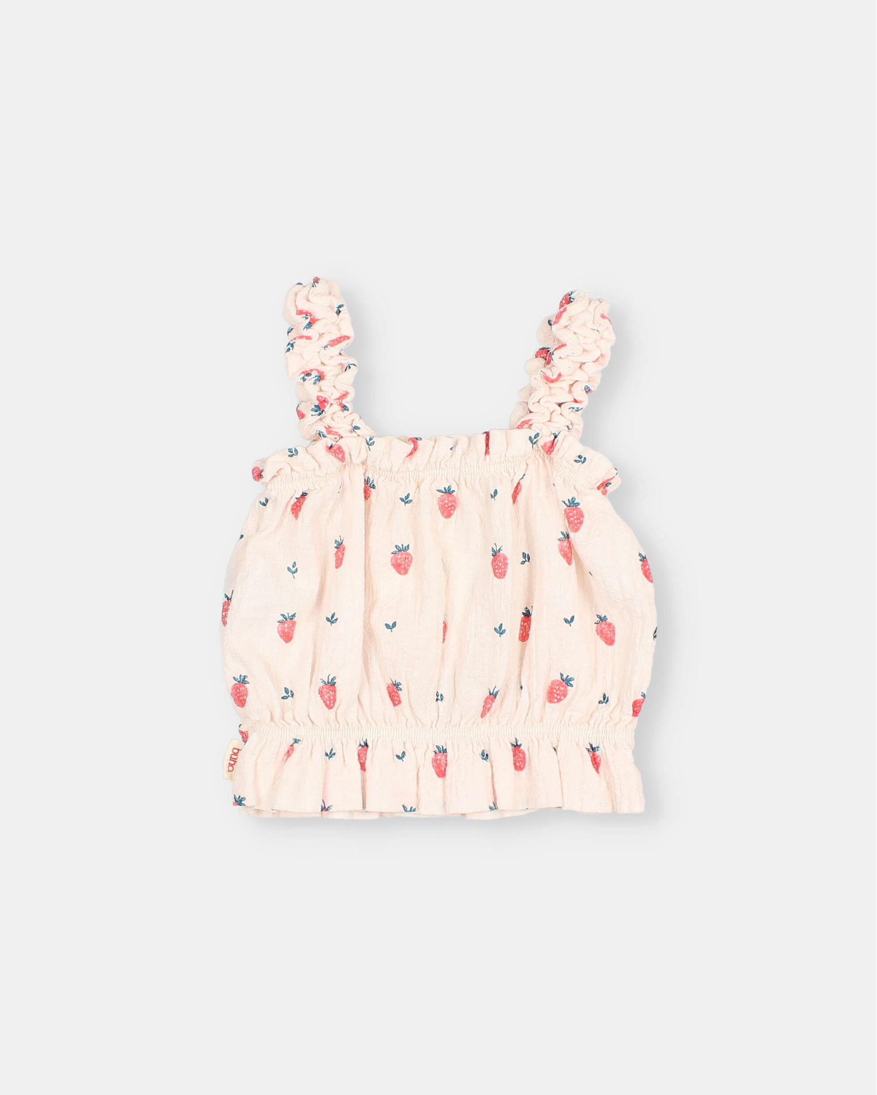 Top de algodón orgánico texturado con estampado strawberry. Escote recto con goma elástica. Tirantes elásticos. Bajo con volantito y goma elástica.