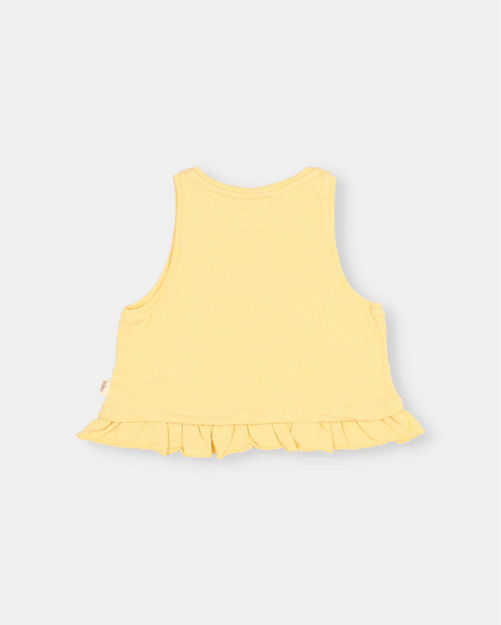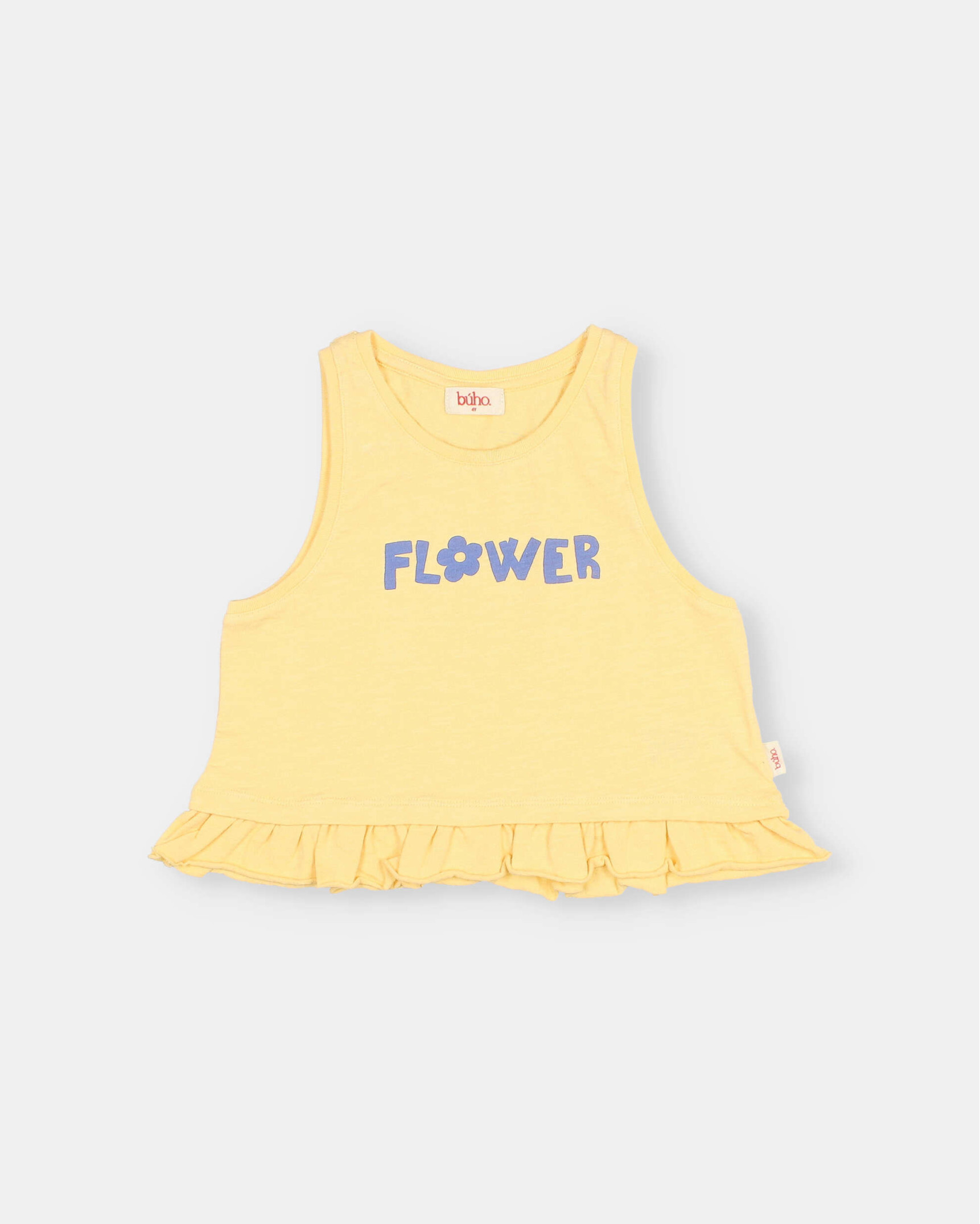 Top con estampado flower de algodón orgánico. Volante en el bajo. Cuello redondo.