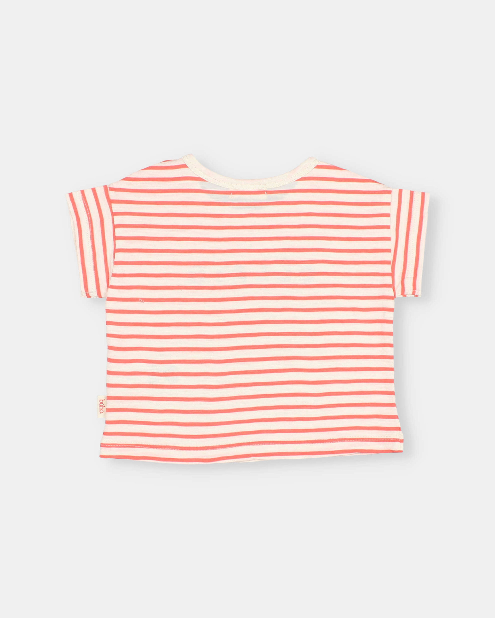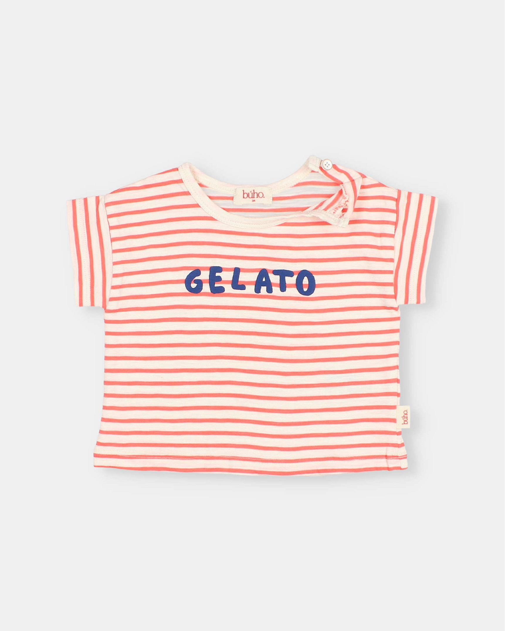 Camiseta de rayas en algodón orgánico con motivo estampado gelato en pecho. Cuello redondo crudo con cierre de botón en el hombro. Manga corta.