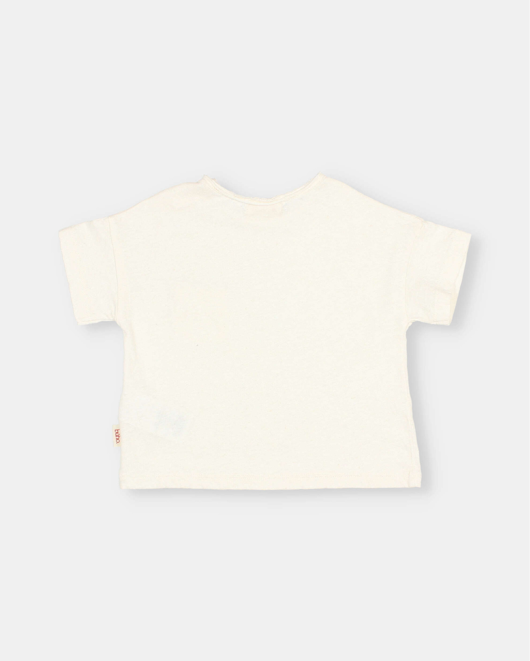 Camiseta de algodón lino de manga corta. Cuello redondo con cierre de botón de madera en el hombro. Bolsillo de decoración en pechera.
