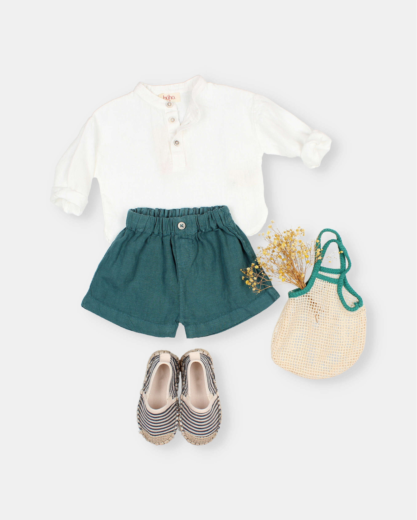Pantalón corto de lino 100% con suave efecto lavado y un aire relajado. Cintura elástica con botón decorativo. Bolsillo tipo plastrón en la espalda con bordado al tono.