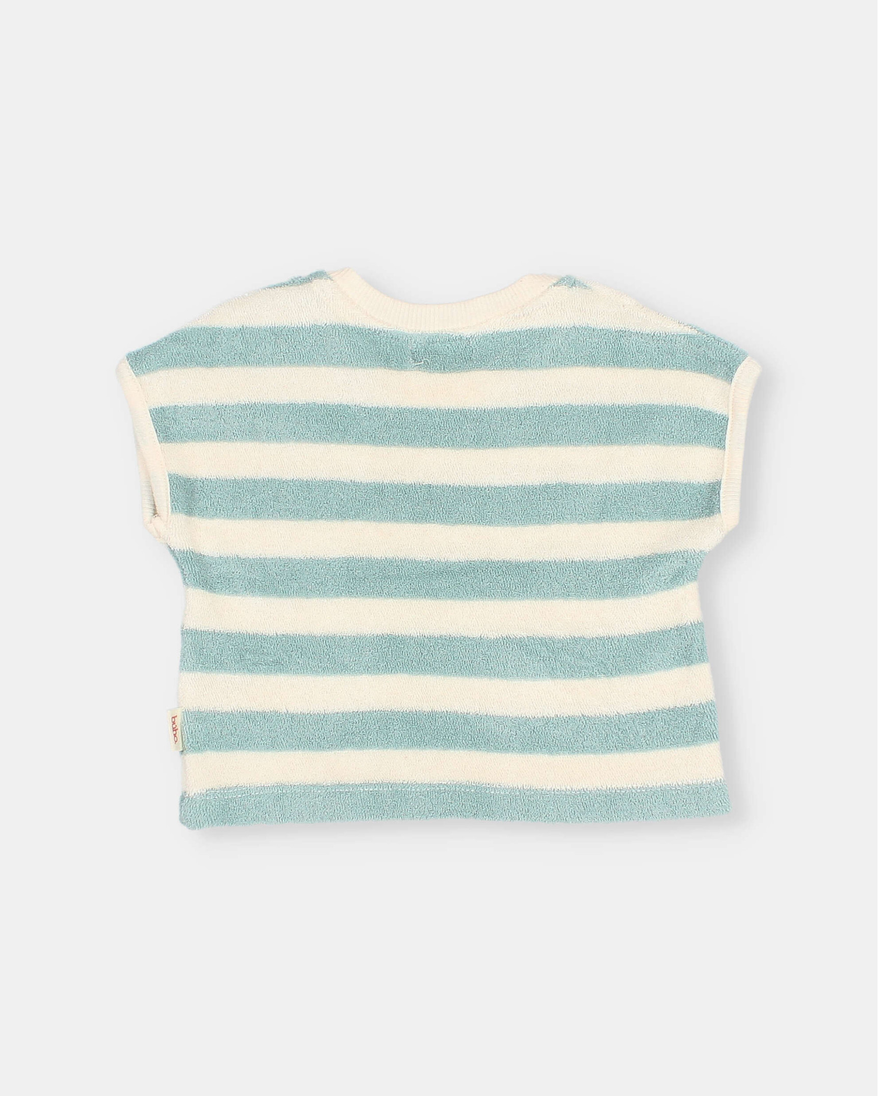 Camiseta de rizo suave de algodón orgánico tejido a rayas. Cuello redondo con cierre de botones en el hombro. Manga corta. Acabados escote y sisas en canalé de algodón crudo.