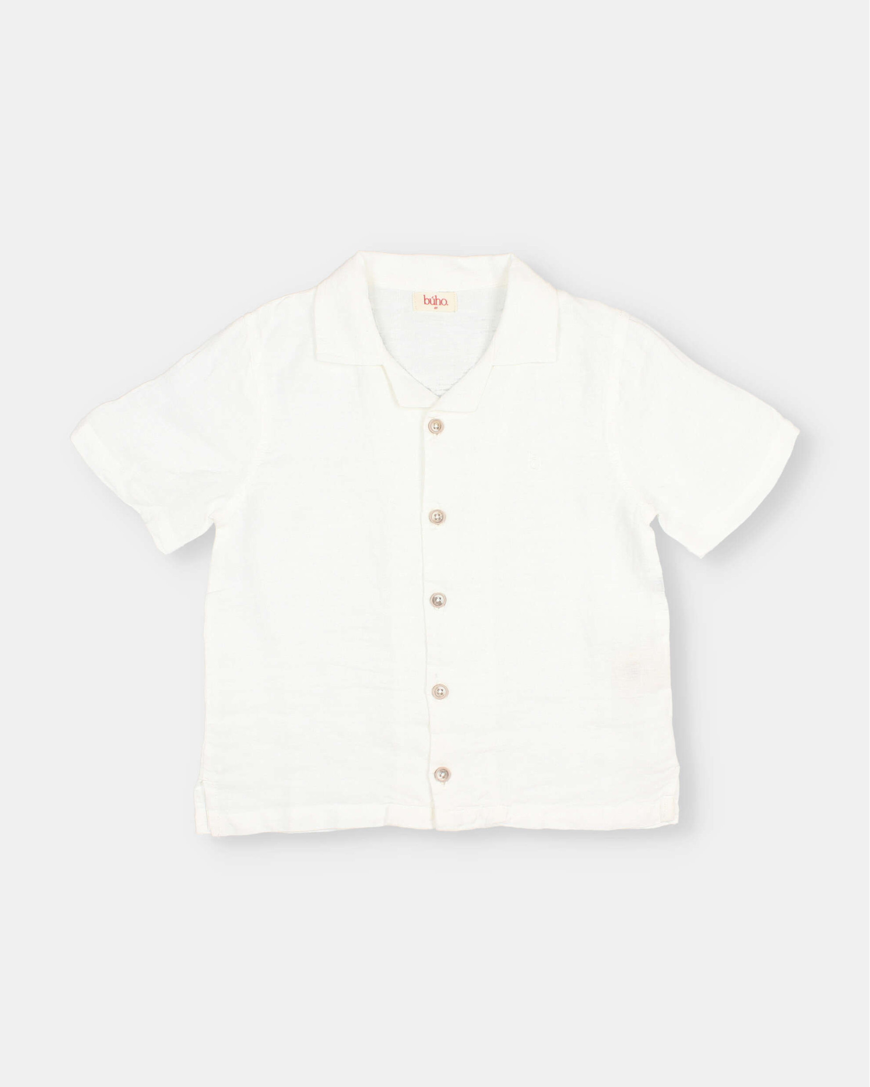 Camisa de lino 100% con suave efecto lavado y un aire relajado. Manga corta. Cuello tipo bowling y abotonado delantero. Detalle bordado al tono en el pecho.