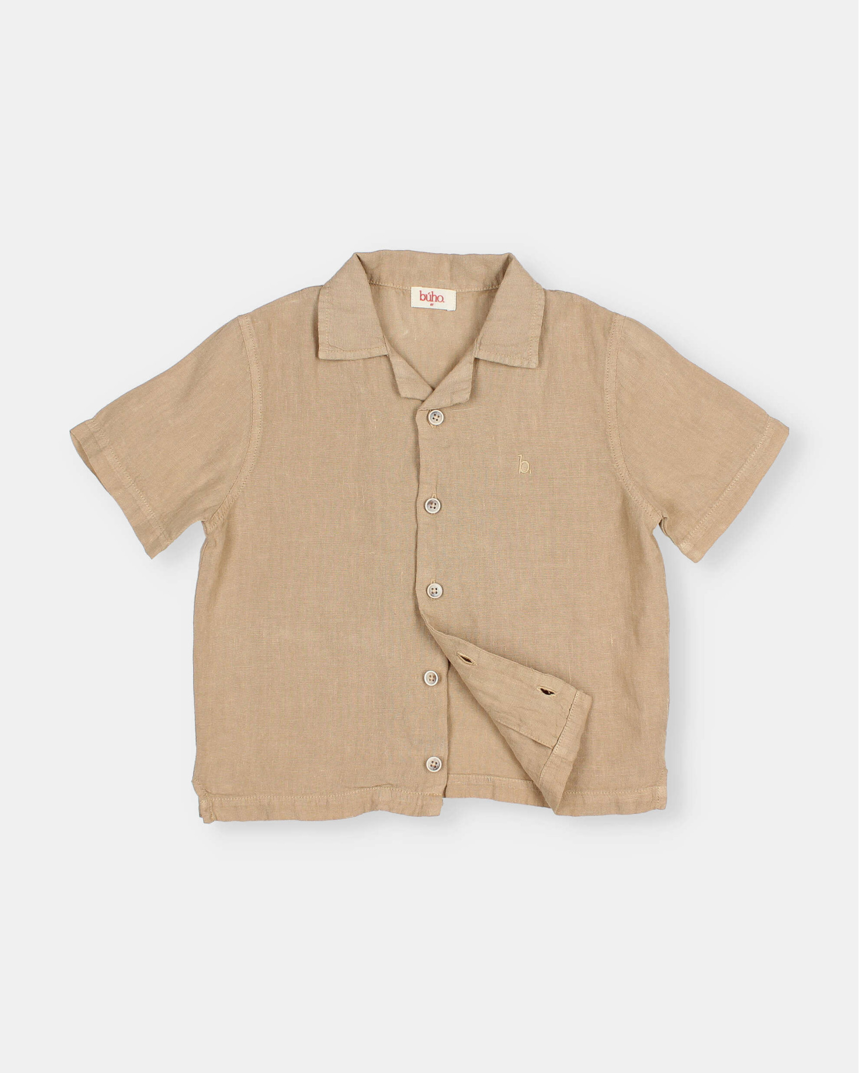 Camisa de lino 100% con suave efecto lavado y un aire relajado. Manga corta. Cuello tipo bowling y abotonado delantero. Detalle bordado al tono en el pecho.