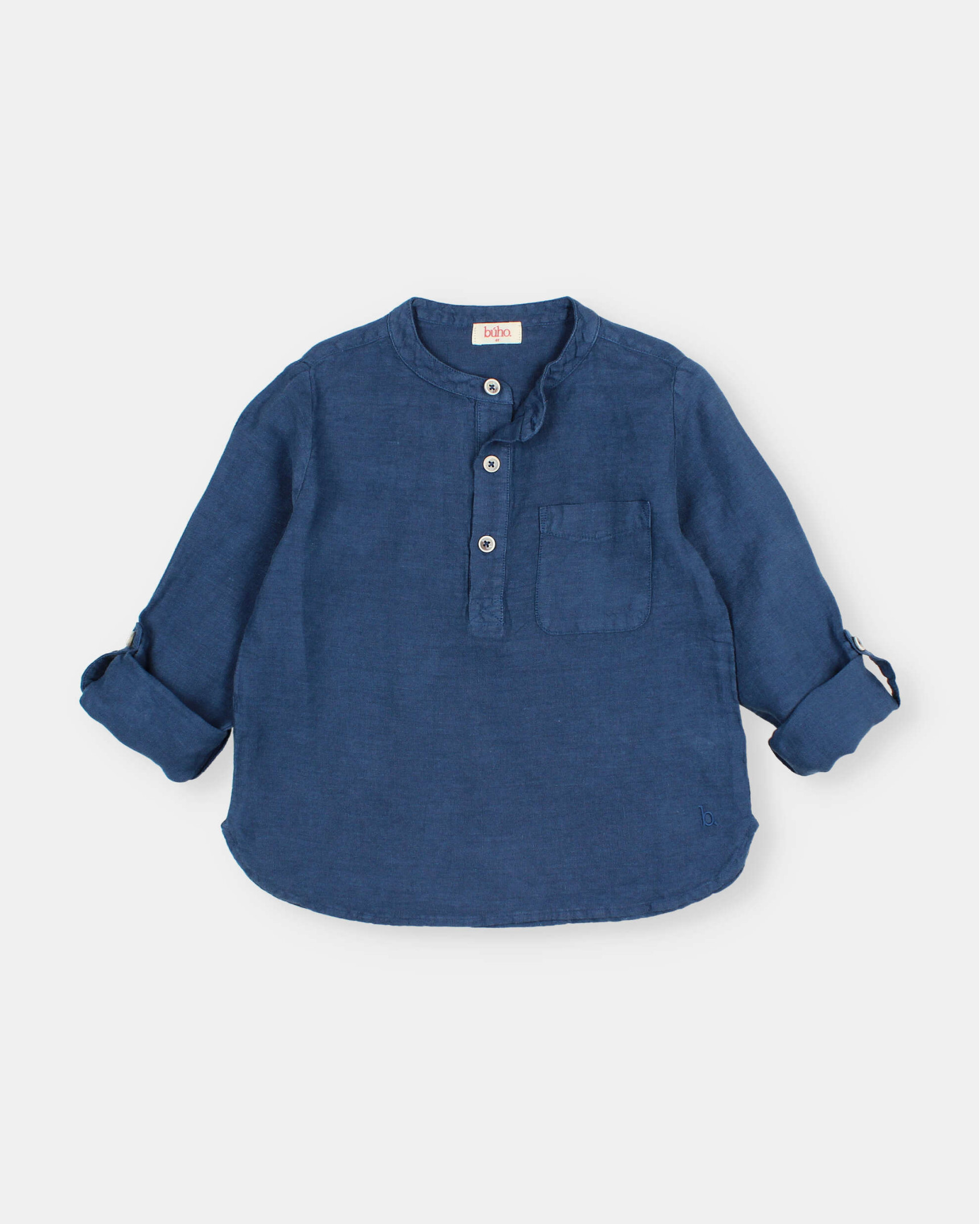 Camisa de lino 100% con suave efecto lavado y un aire relajado. Manga larga y cuello mao. Con bolsillo en el pecho. Abertura con tapeta y botones. Trinchas en la manga para arremangar. Detalle bordado al tono.