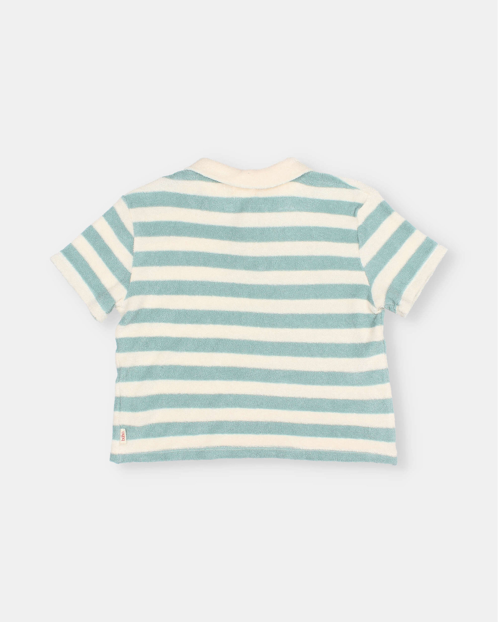 Polo de rizo suave de algodón orgánico tejido a rayas. Cuello a contraste en crudo tipo polo con tapeta y botón. Manga corta.
