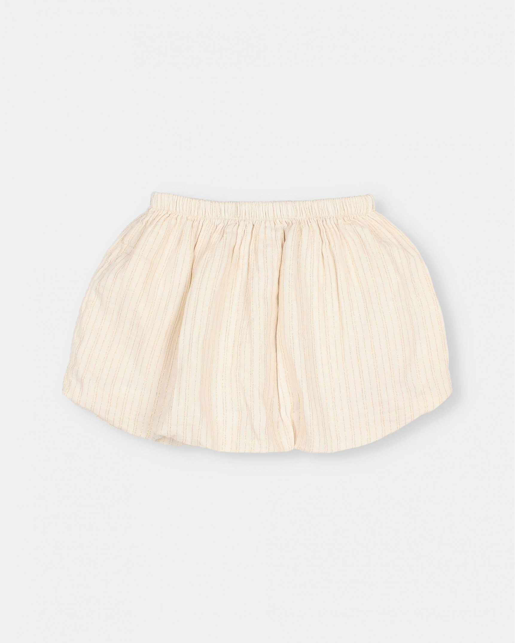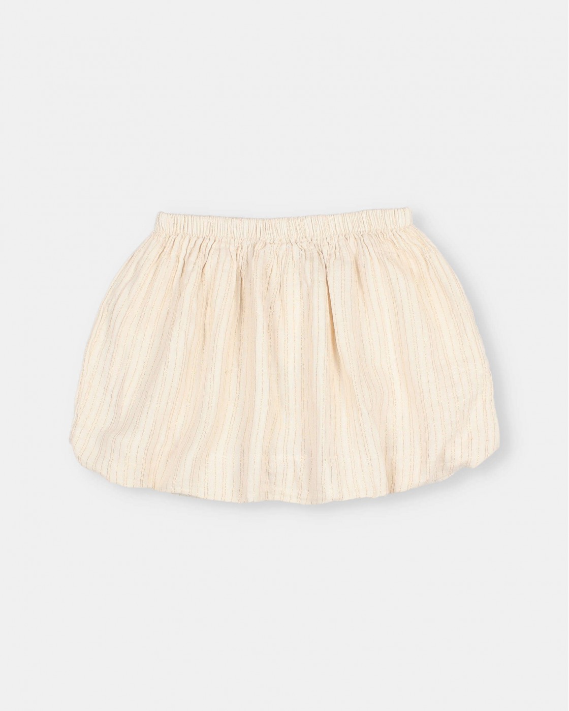 Falda abullonada de dobletela con rayita lurex. Cintura y bajo con goma elástica.