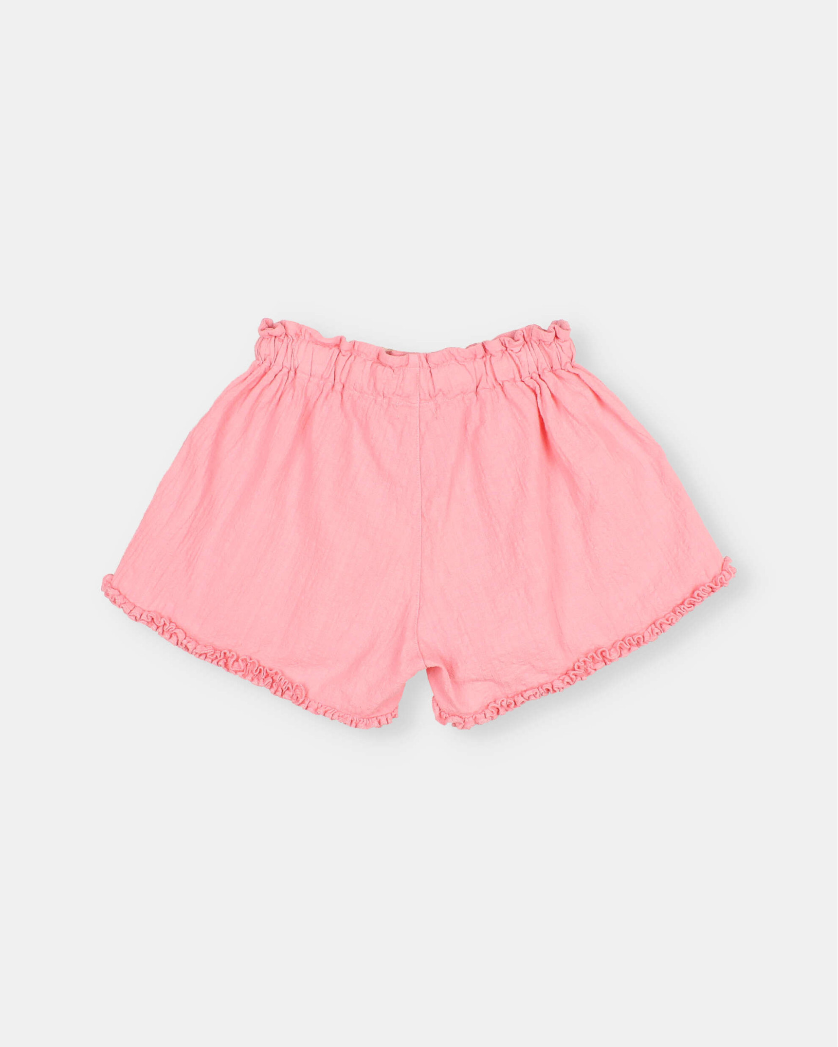 Pantalón corto de algodón orgánico texturado con volantitos. Cintura elástica con cinta de algodón crudo para ajustar. Detalle bordado a contraste.