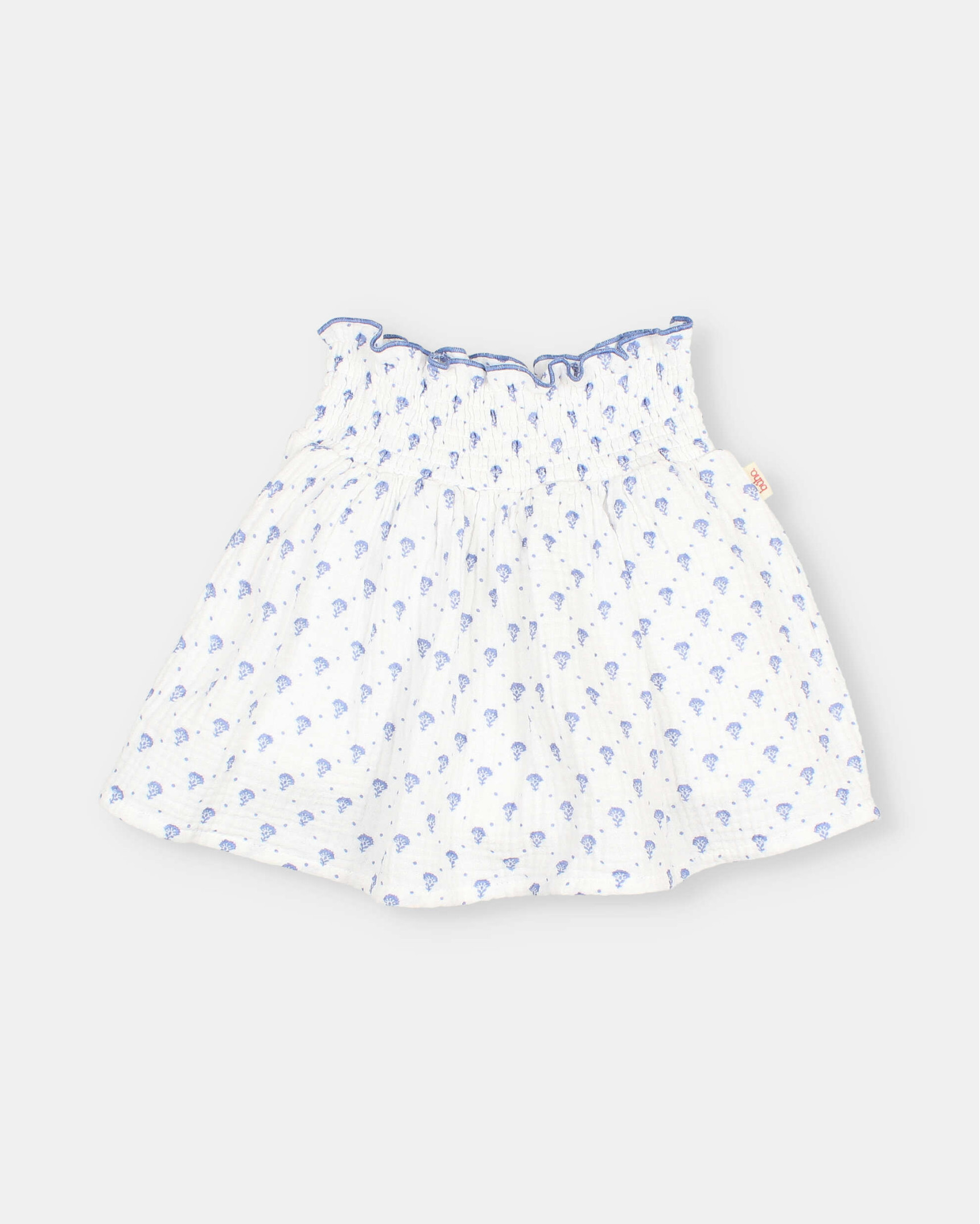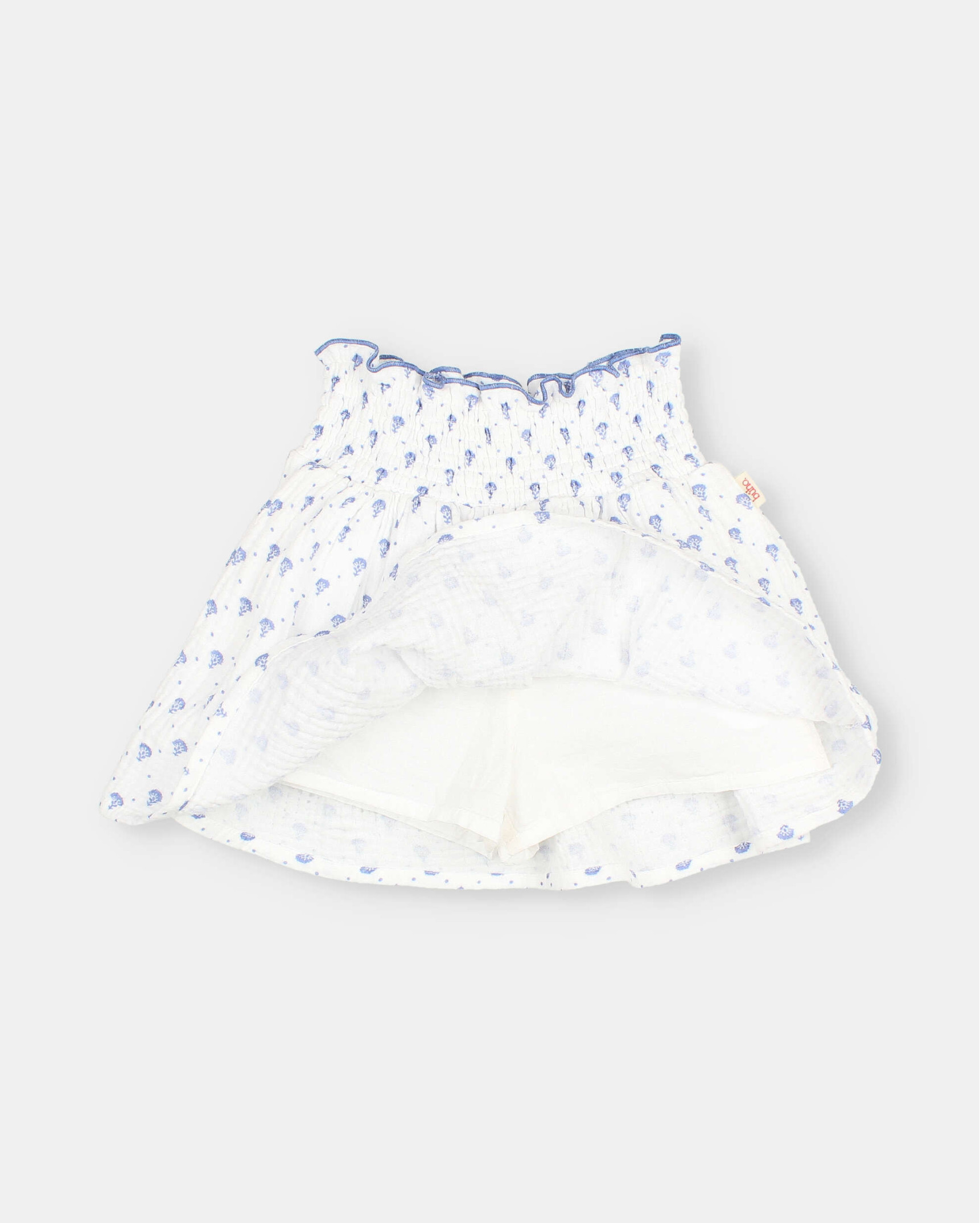 Falda de muselina de algodón con estampado bali. Cintura con goma elástica y volantito con acabado repulgo a contraste. Faldón con vuelo. Forro interior tipo short.