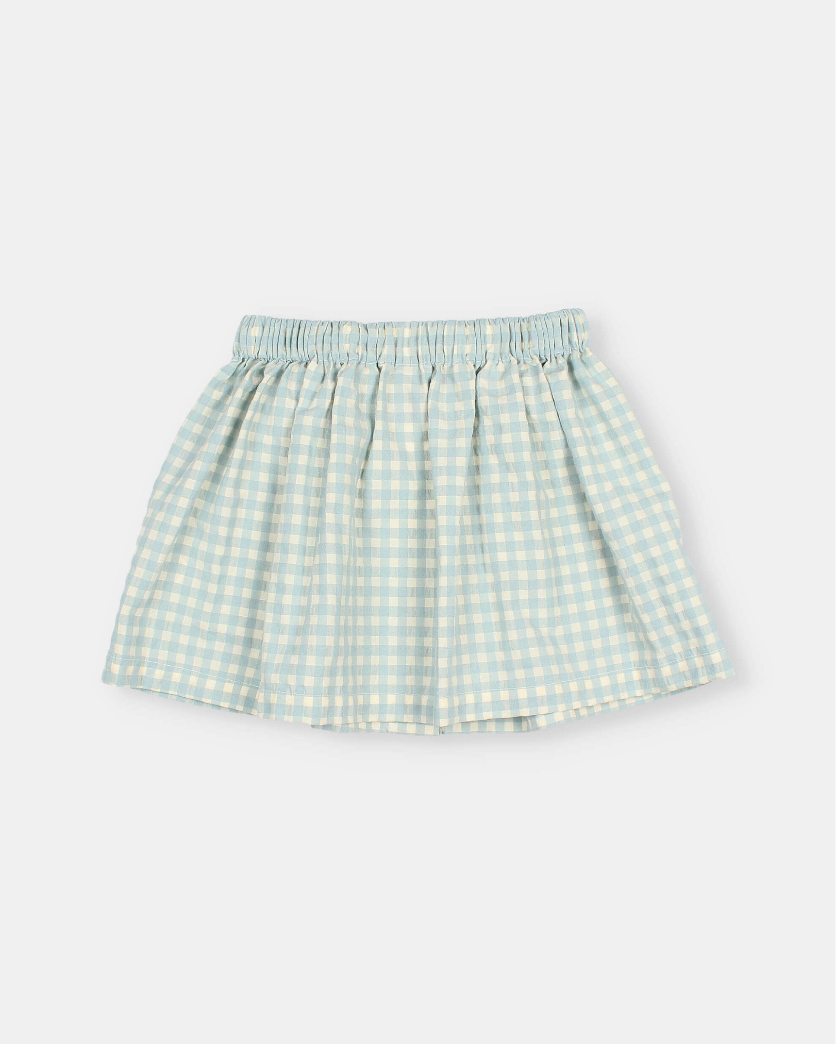 Falda de cuadro vichy en seersucker de algodón. Espalda de la cinturilla elástica. Abotonado delantero con botones de madera. Faldón con fruncido. Bolsillos laterales con detalle de puntilla ondulina. Bordado y ojales con hilo a contraste.