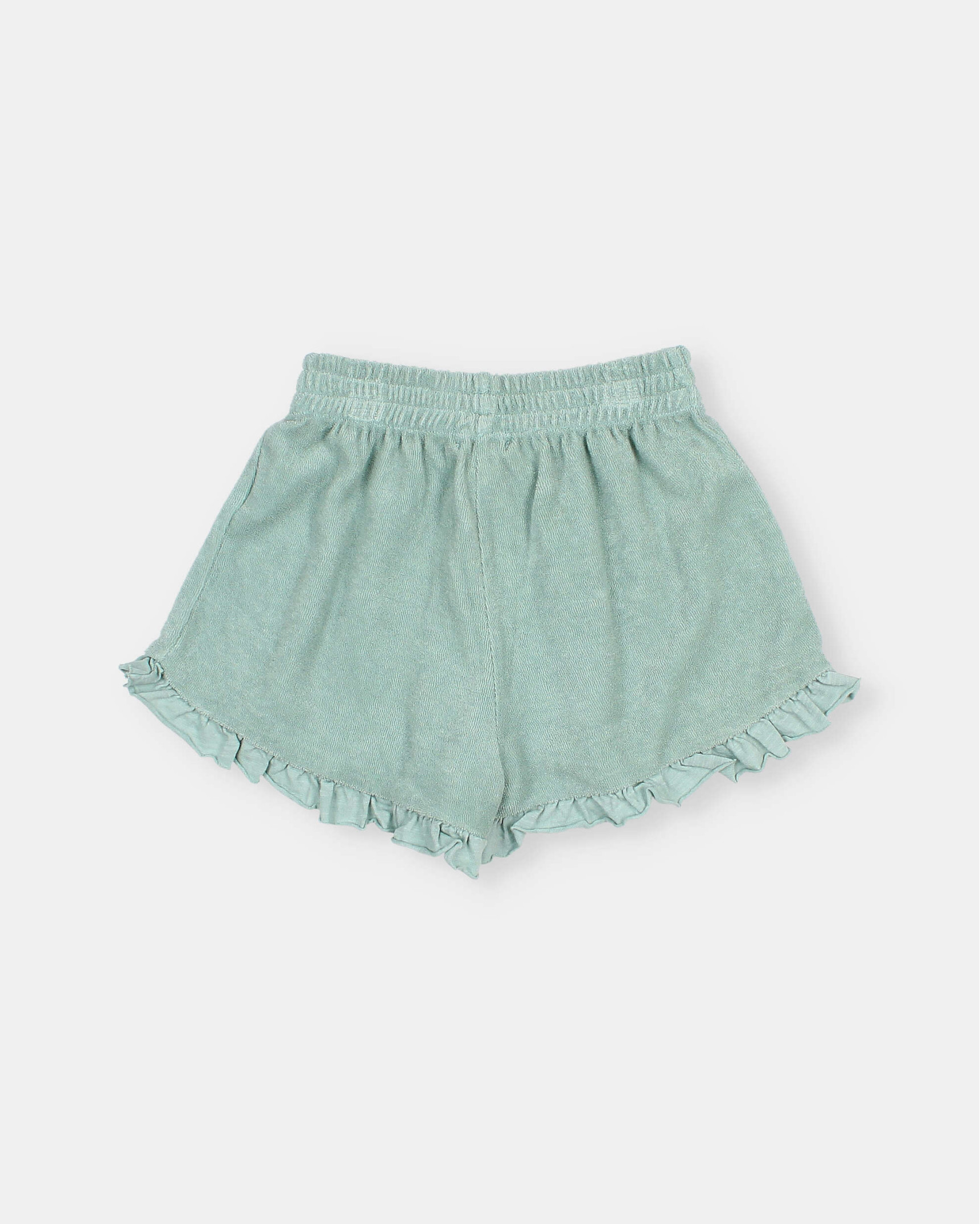 Pantalón corto de rizo suave con volante de punto liso algodón. Cintura elástica. Detalle bordado a contraste.