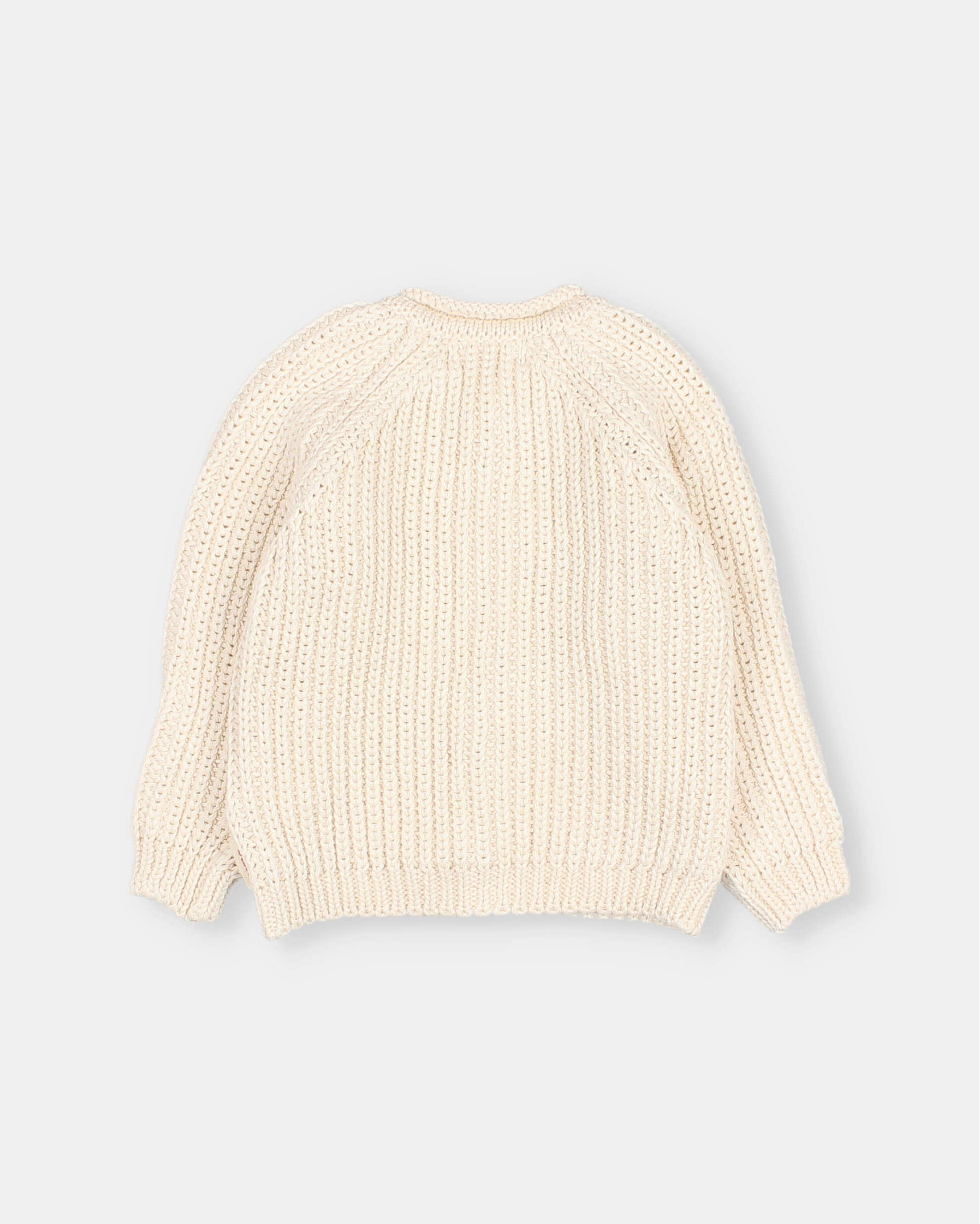 Cardigan de punto perlado de algodón orgánico. Manga larga ranglán. Cuello redondo. Abotonado delantero con botones de madera.
