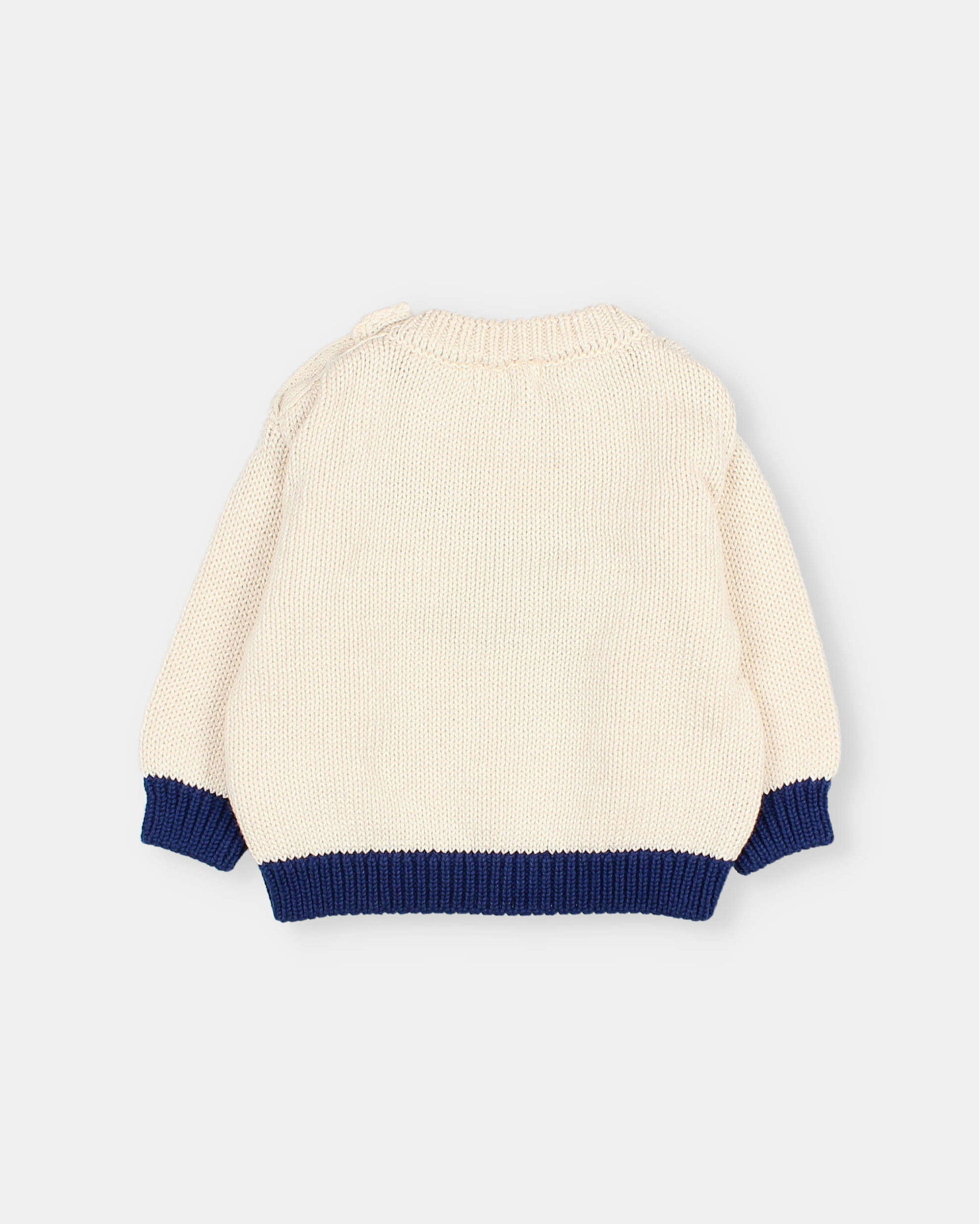 Jersey de punto de algodón orgánico con motivo bird. Cuello redondo. Dos botones de madera para apertura del cuello. Puños y bajo a contraste.