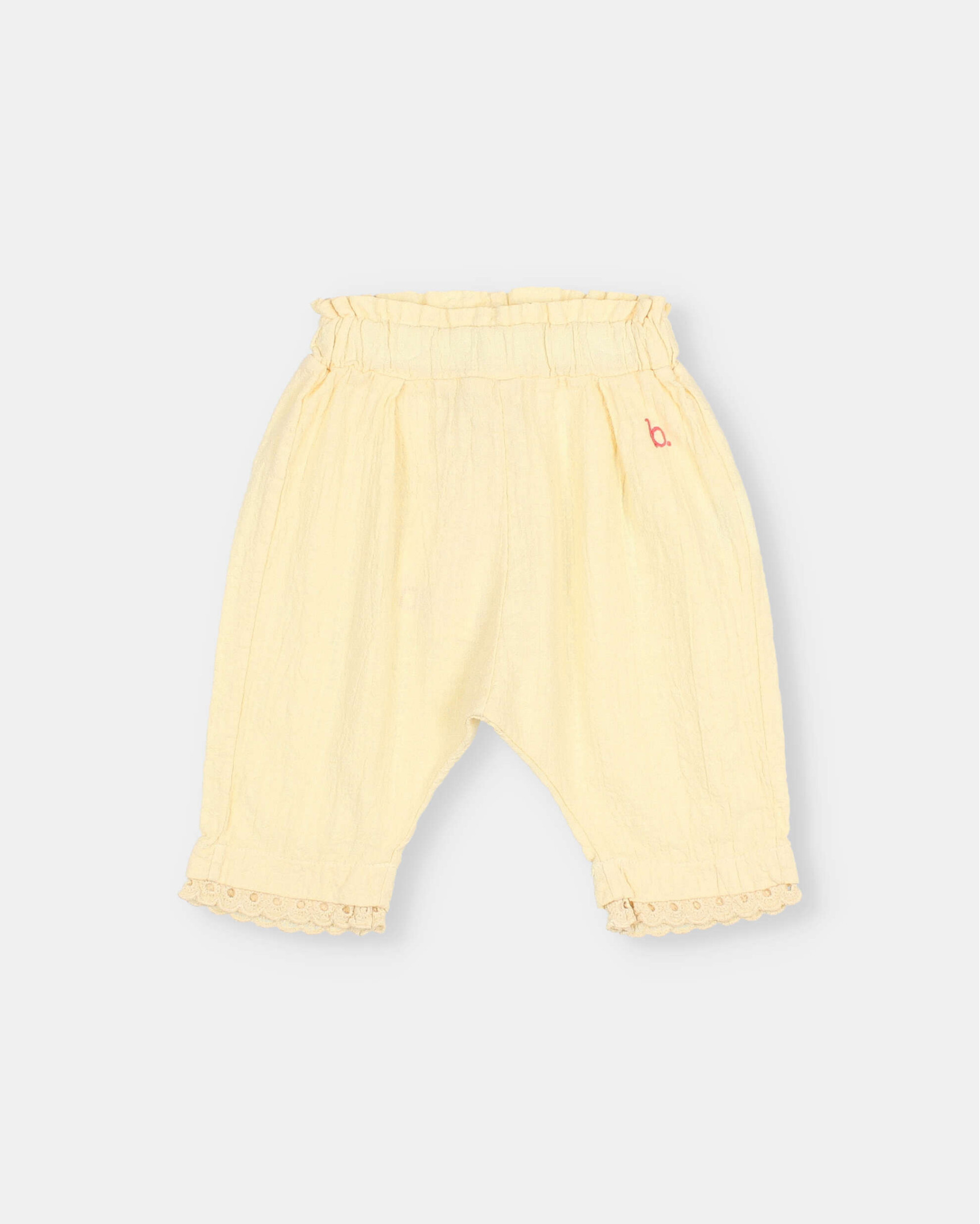 Pantalón largo de algodón orgánico texturado. Detalle puntilla en el bajo. Cinturilla elástica con bordado decorativo a contraste.