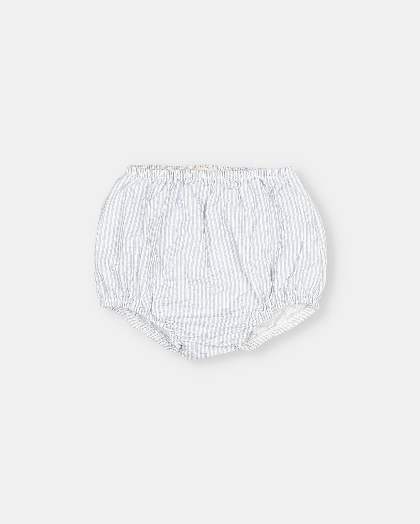 Bombacho en seersucker de algodón con estampado a rayas. Bolsillos tipo plastrón en la espalda. Detalle bordado a contraste. Goma elástica en la cinturilla y muslos.