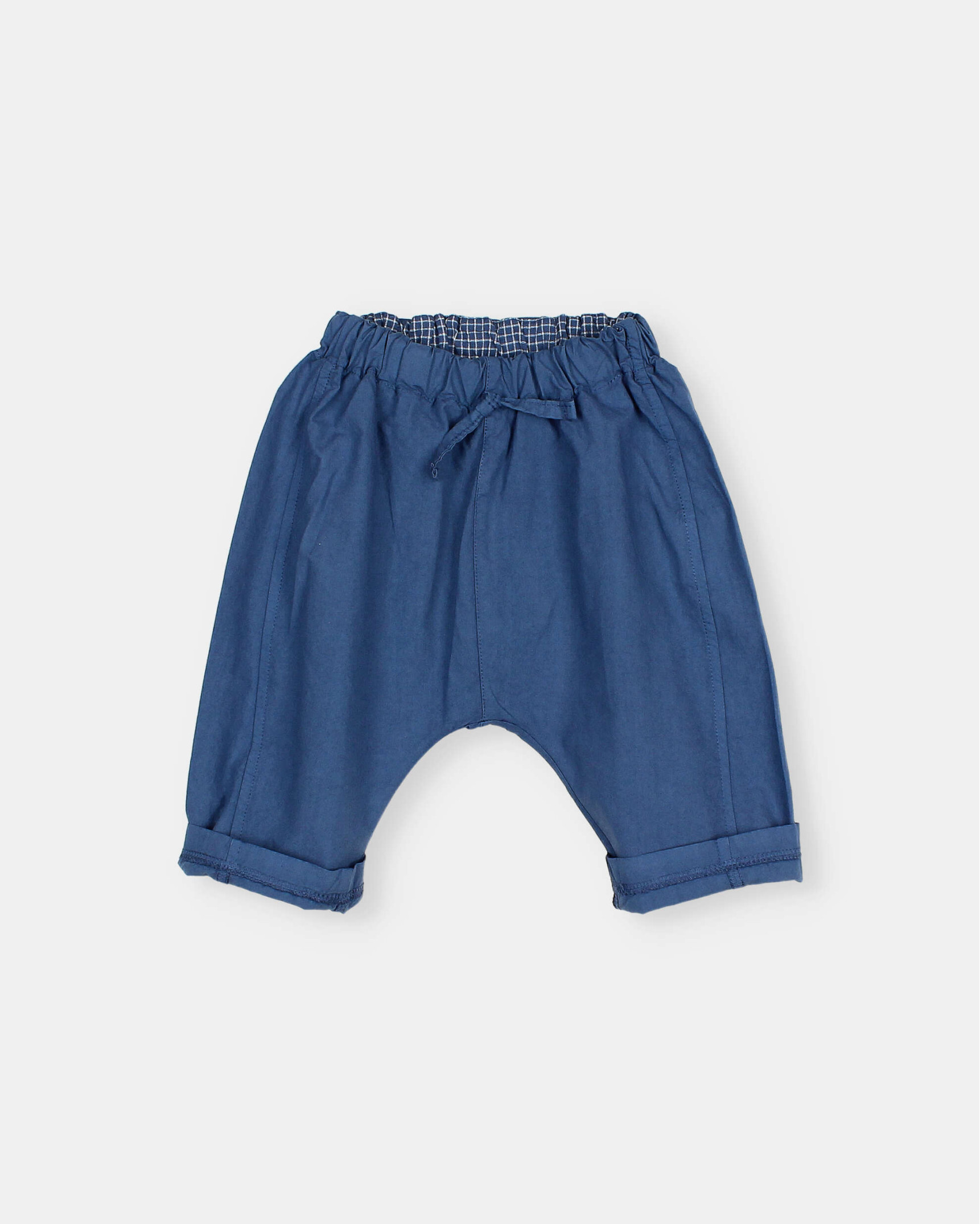 Pantalón largo de popelín en algodón orgánico. Cinturilla elástica con cinta decorativa. Bolsillo tipo plastrón en la espalda con etiqueta decorativa.