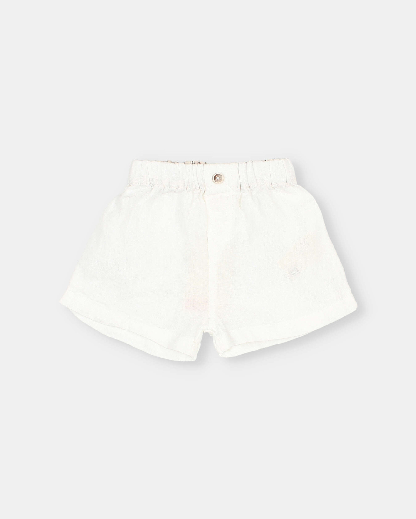 Pantalón corto de lino 100% con suave efecto lavado y un aire relajado. Cintura elástica con botón decorativo. Bolsillo tipo plastrón en la espalda con bordado al tono.