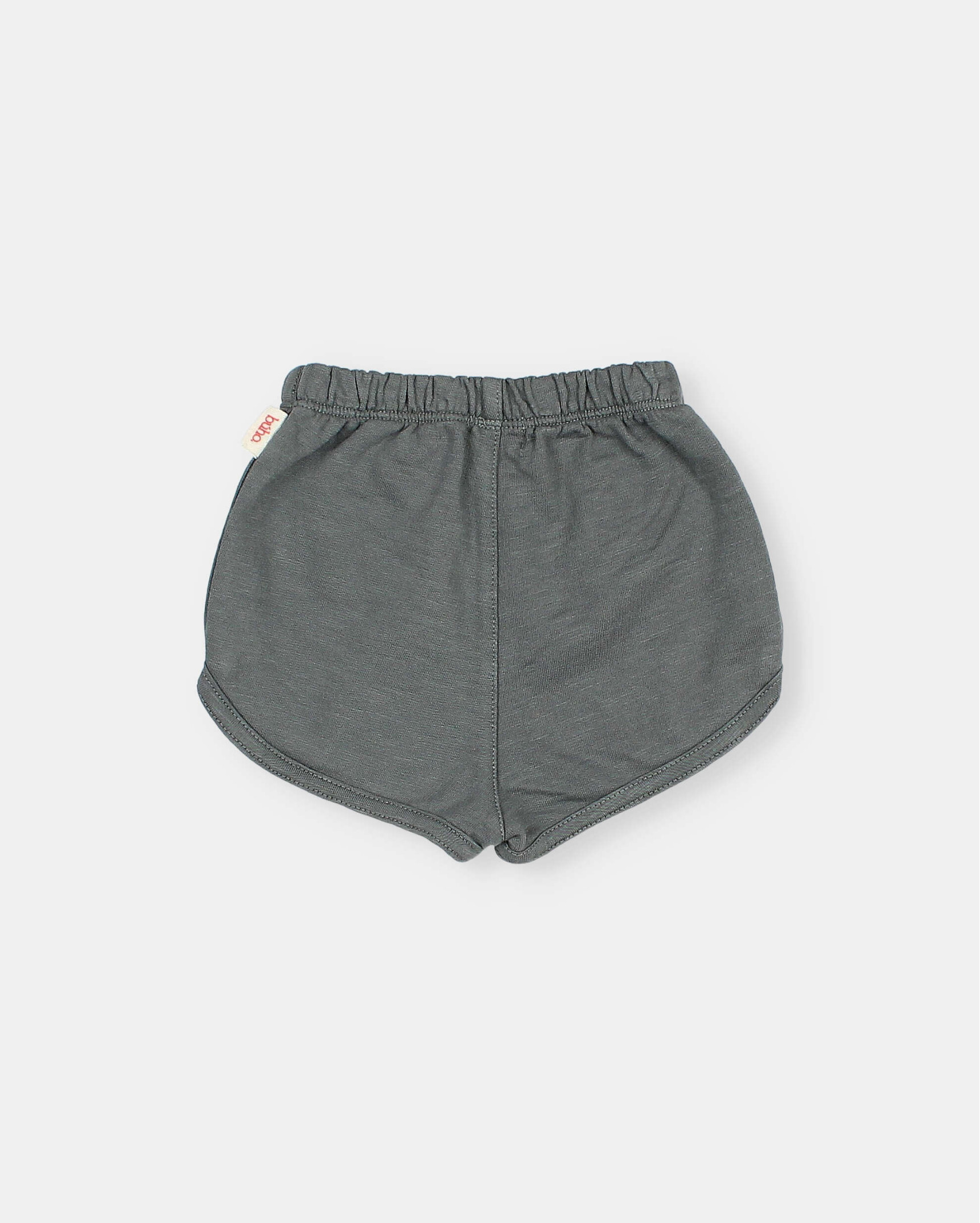 Pantalón corto de felpa suave en algodón orgánico. Cinturilla elástica con cinta de algodón crudo decorativa. Costura en el bajo que sube por el lateral.