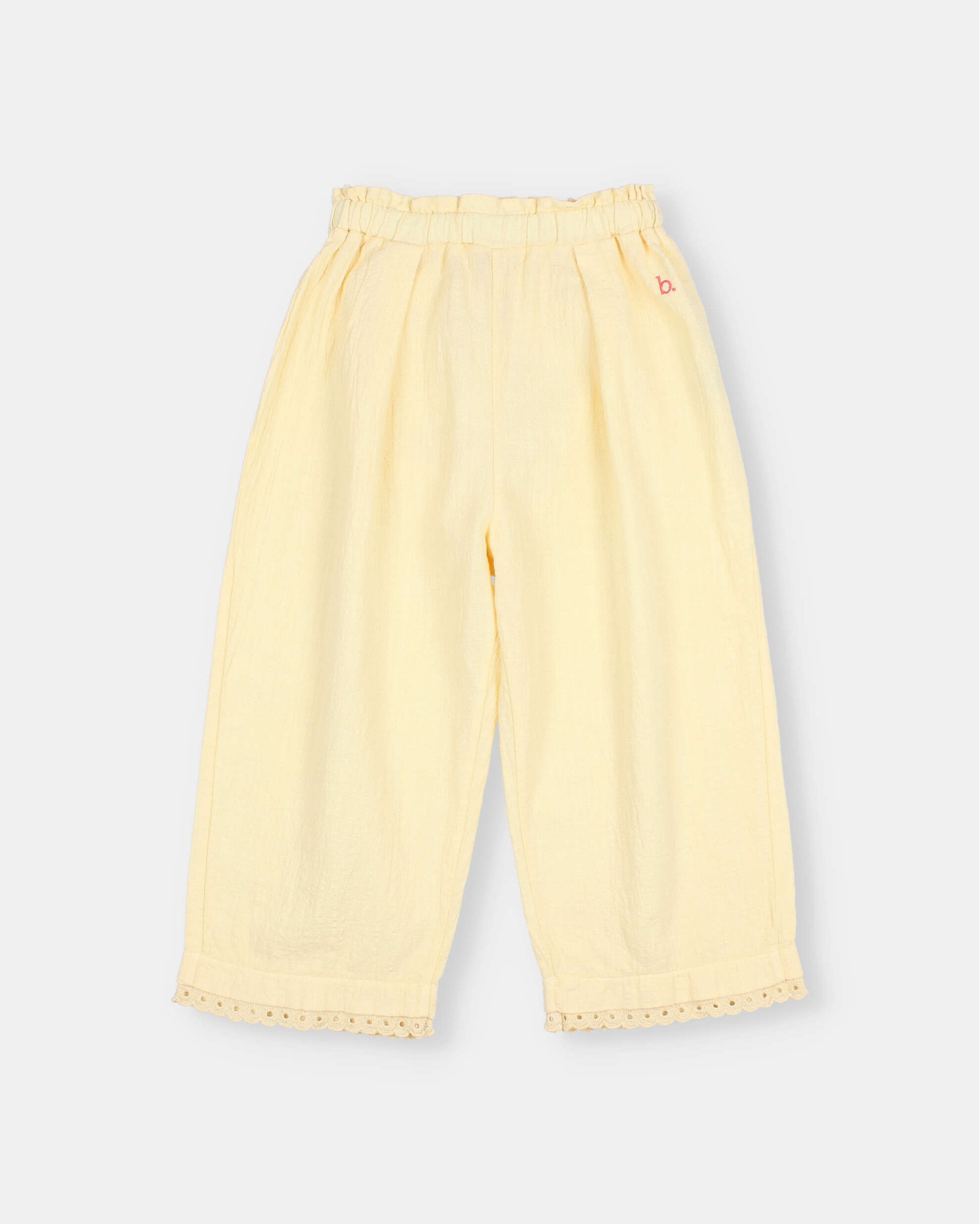 Pantalón largo de algodón orgánico texturado. Detalle puntilla en el bajo. Cintura elástica con cinta interior para mejor ajuste. Bordado a contraste decorativo en el lateral.