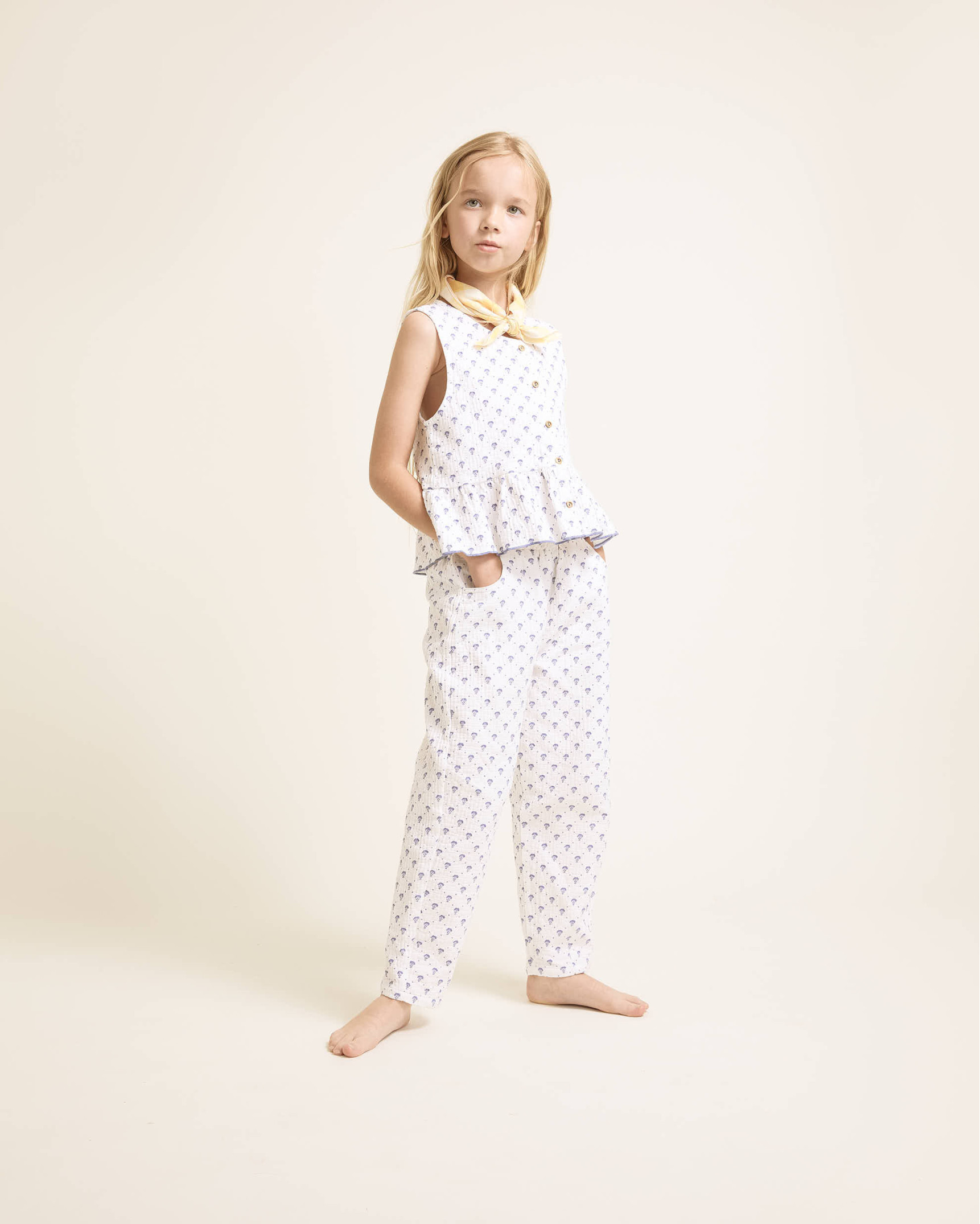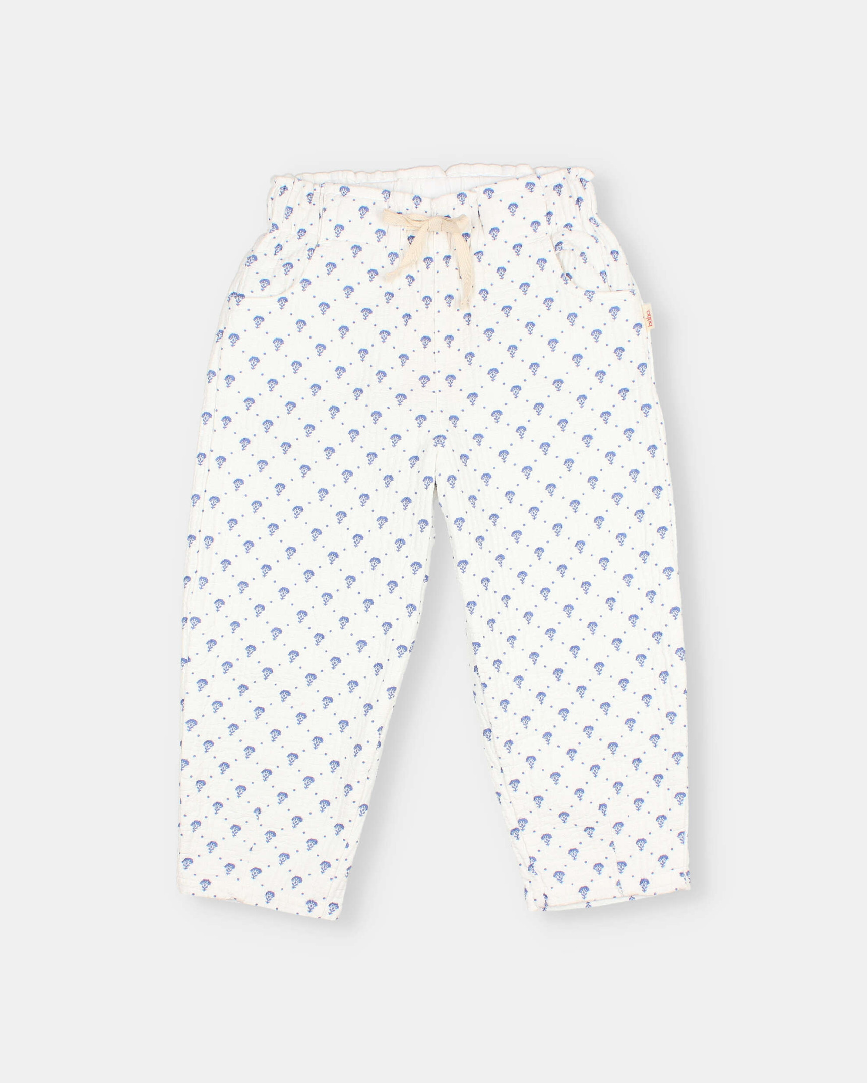 Pantalón largo de algodón pespunteado con estampado bali. Cintura elástica con cinta de algodón crudo para mejor ajuste.