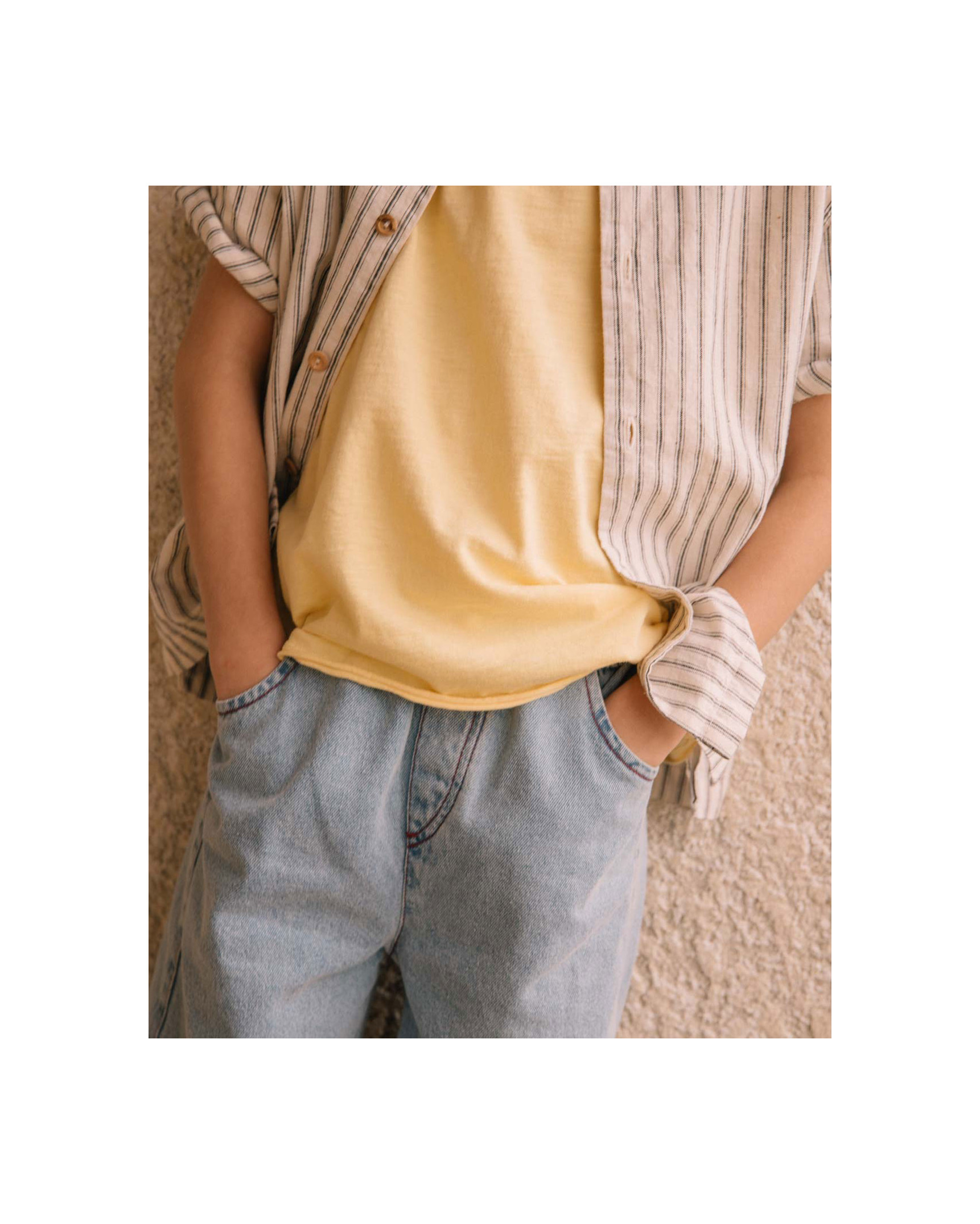 Pantalón largo denim delavado claro. Cintura elástica con trabillas y cordón de algodón crudo para ajustar. Bolsillos frontales y tipo plastrón en la espalda. Detalles de pespuntes y atacados con hilo a contraste.