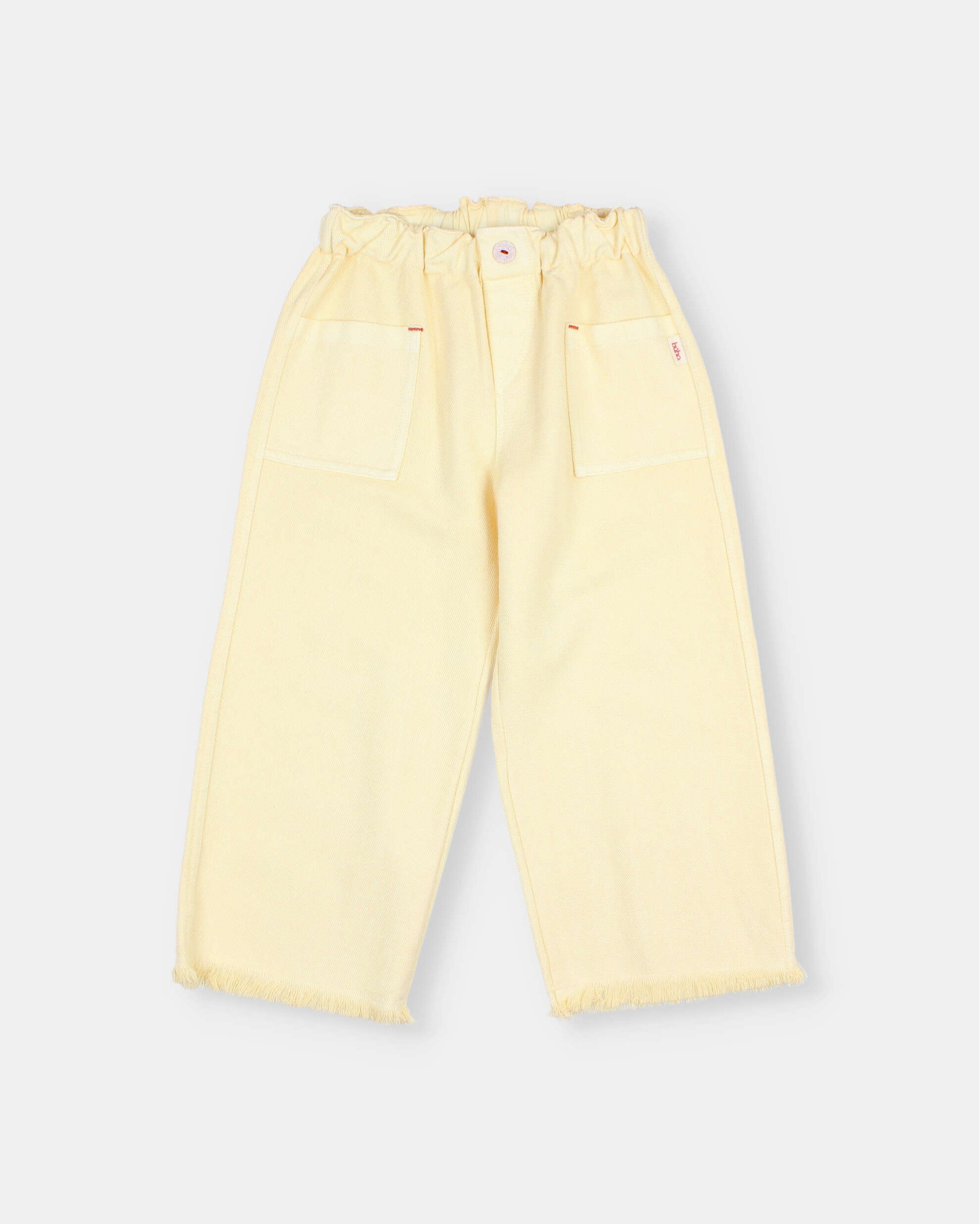 Pantalón largo de sarga. Cintura elástica con cinta de algodón interior para mejor ajuste. Botón decorativo enfrente. Bolsillos tipo plastrón en frente. Bajo deshilachado. Atacados a contraste.