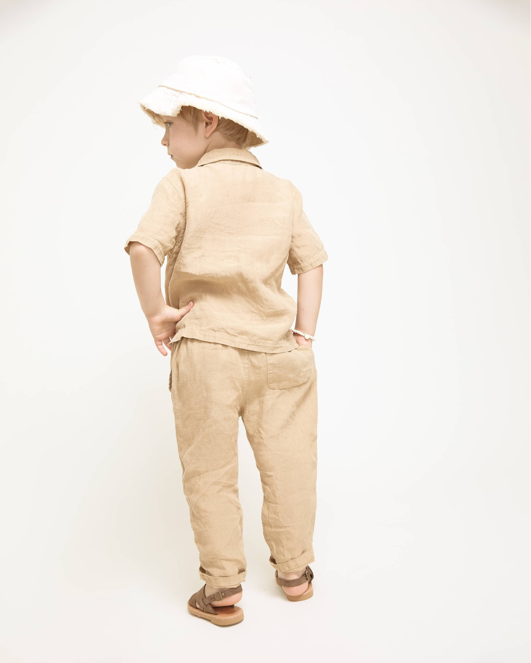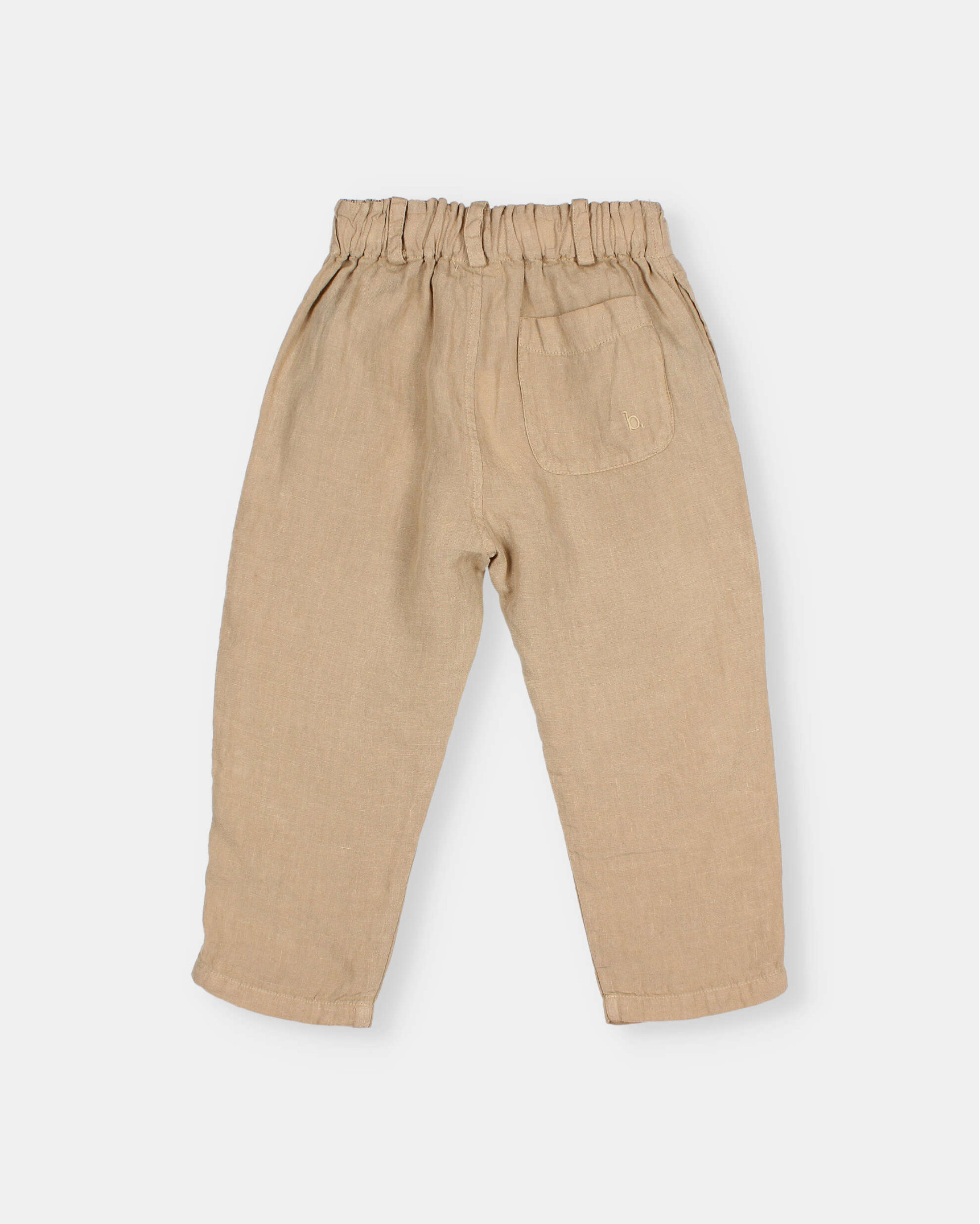 Pantalón largo de lino 100% con suave efecto lavado y un aire relajado. Cintura elástica con cinta de algodón interior para ajustar. Botón decorativo en la cintura. Bolsillos delanteros. Bolsillo tipo plastrón en la espalda con bordado decorativo al tono.