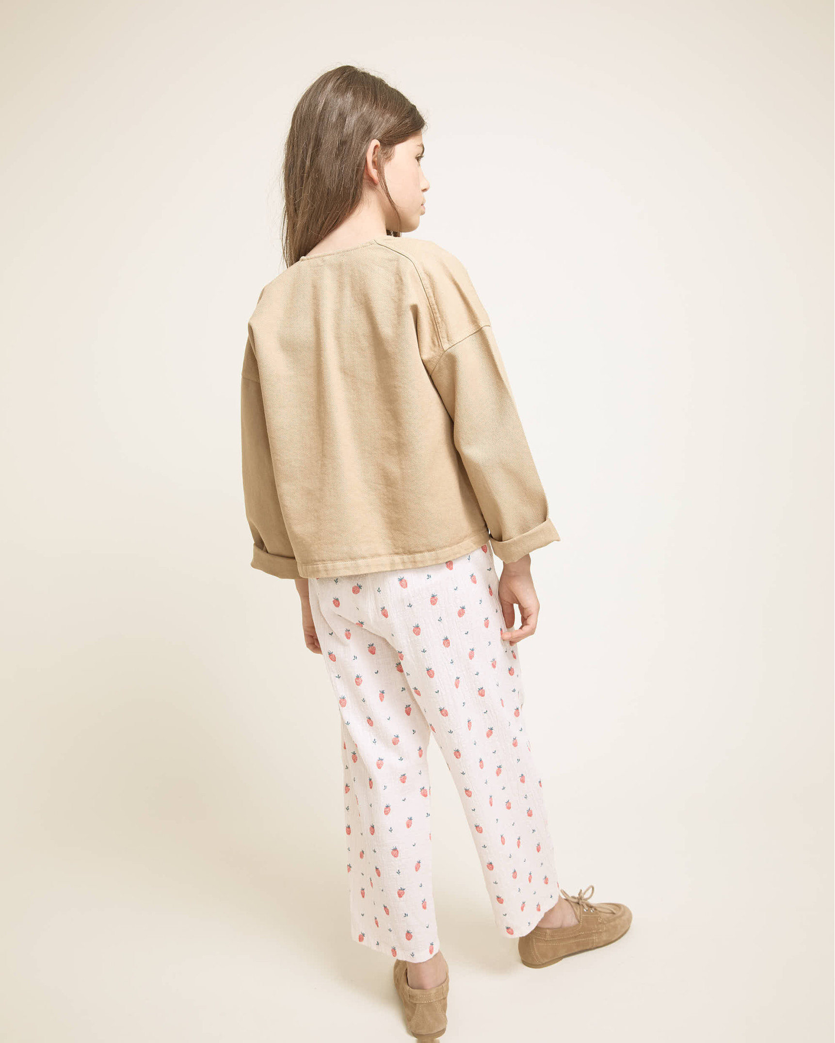 Pantalón largo y ancho de algodón orgánico texturado con estampado strawberry. Cintura elástica con volantito.