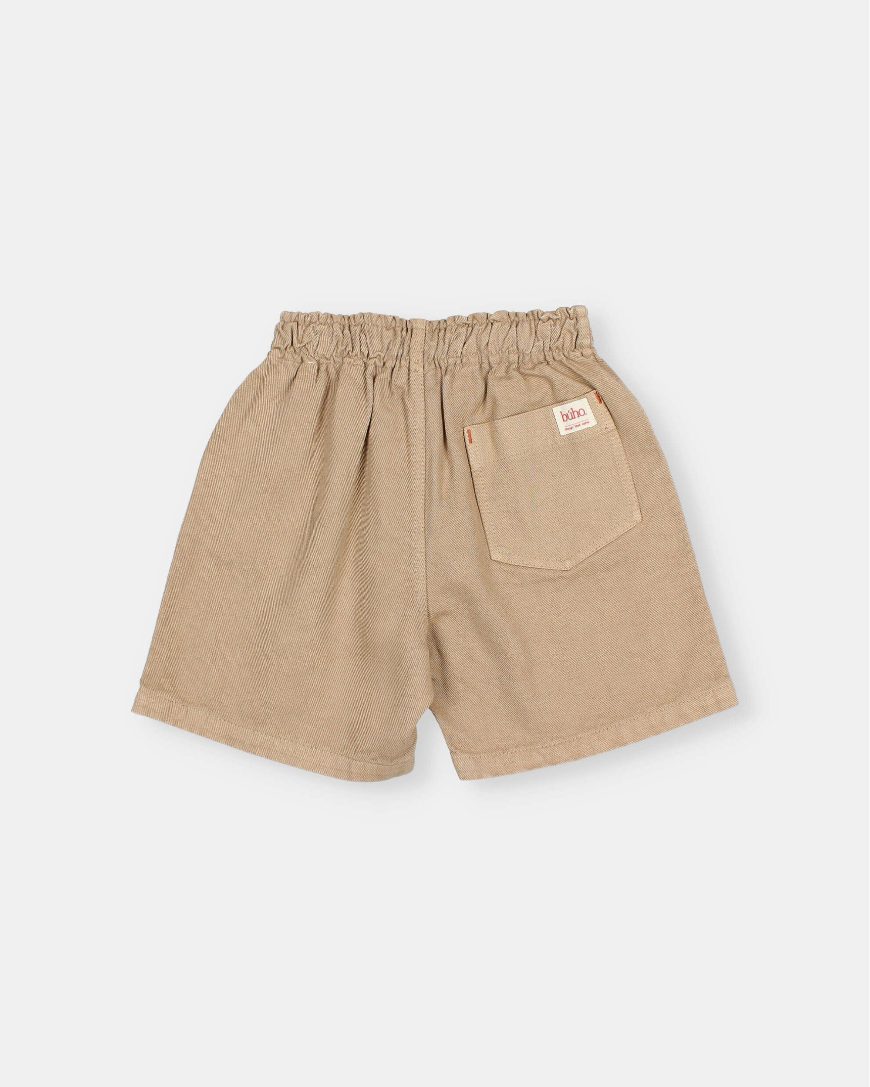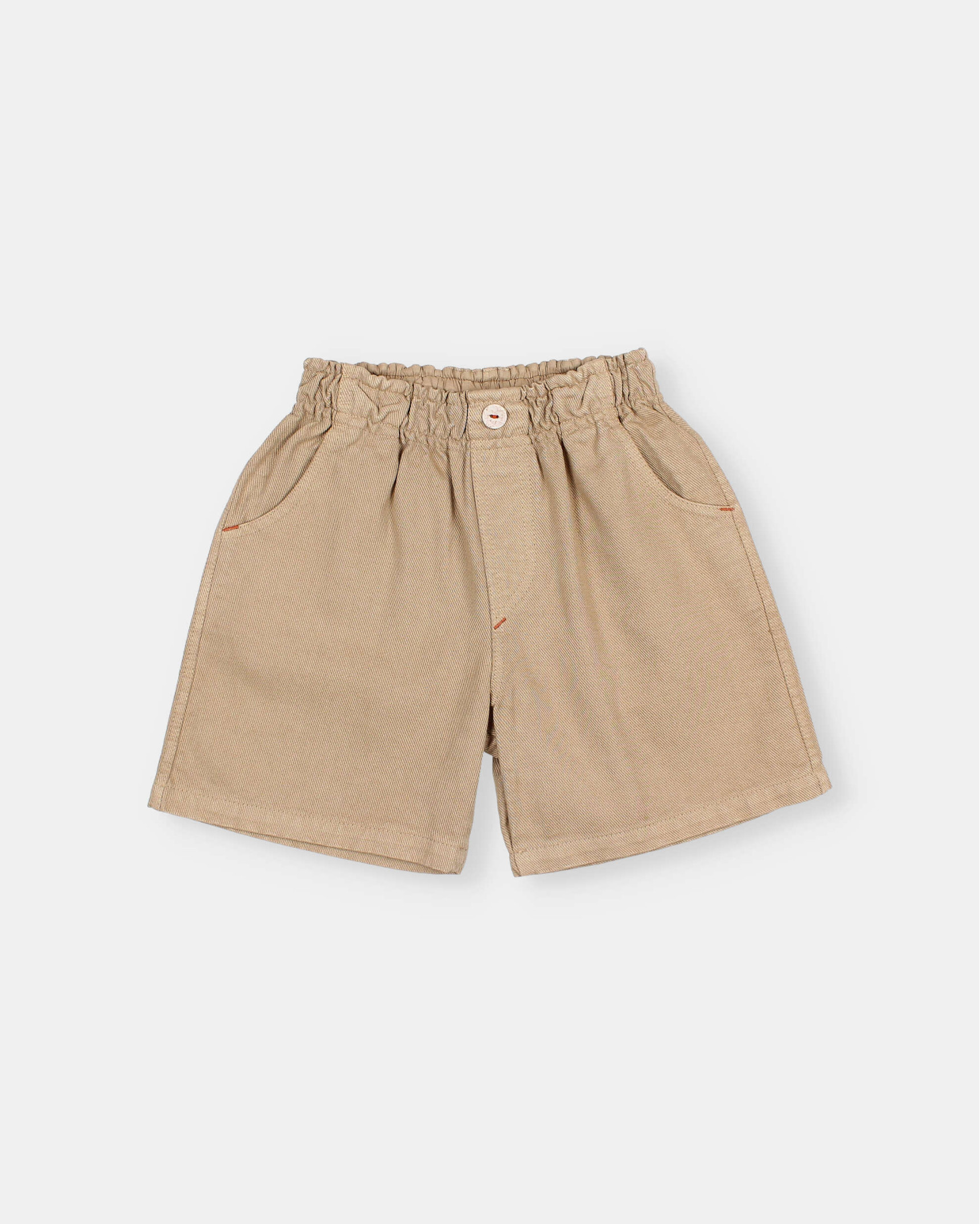 Pantalón corto de sarga. Cintura elástica con cinta de algodón interior para mejor ajuste. Botón decorativo enfrente. Bolsillos frontales. Bolsillo tipo plastrón en la espalda con etiqueta decorativa. Atacados a contraste.