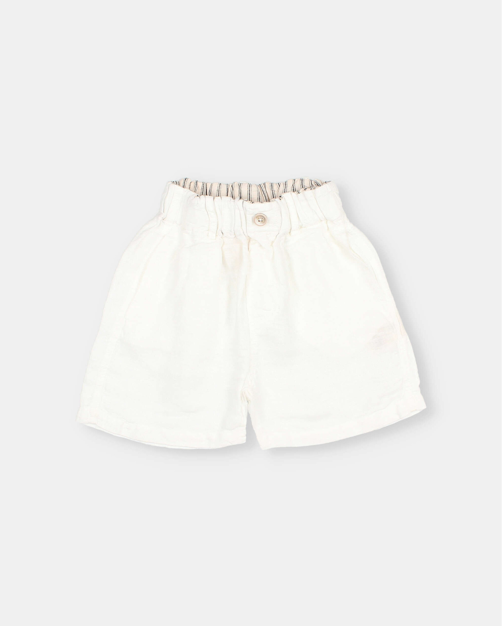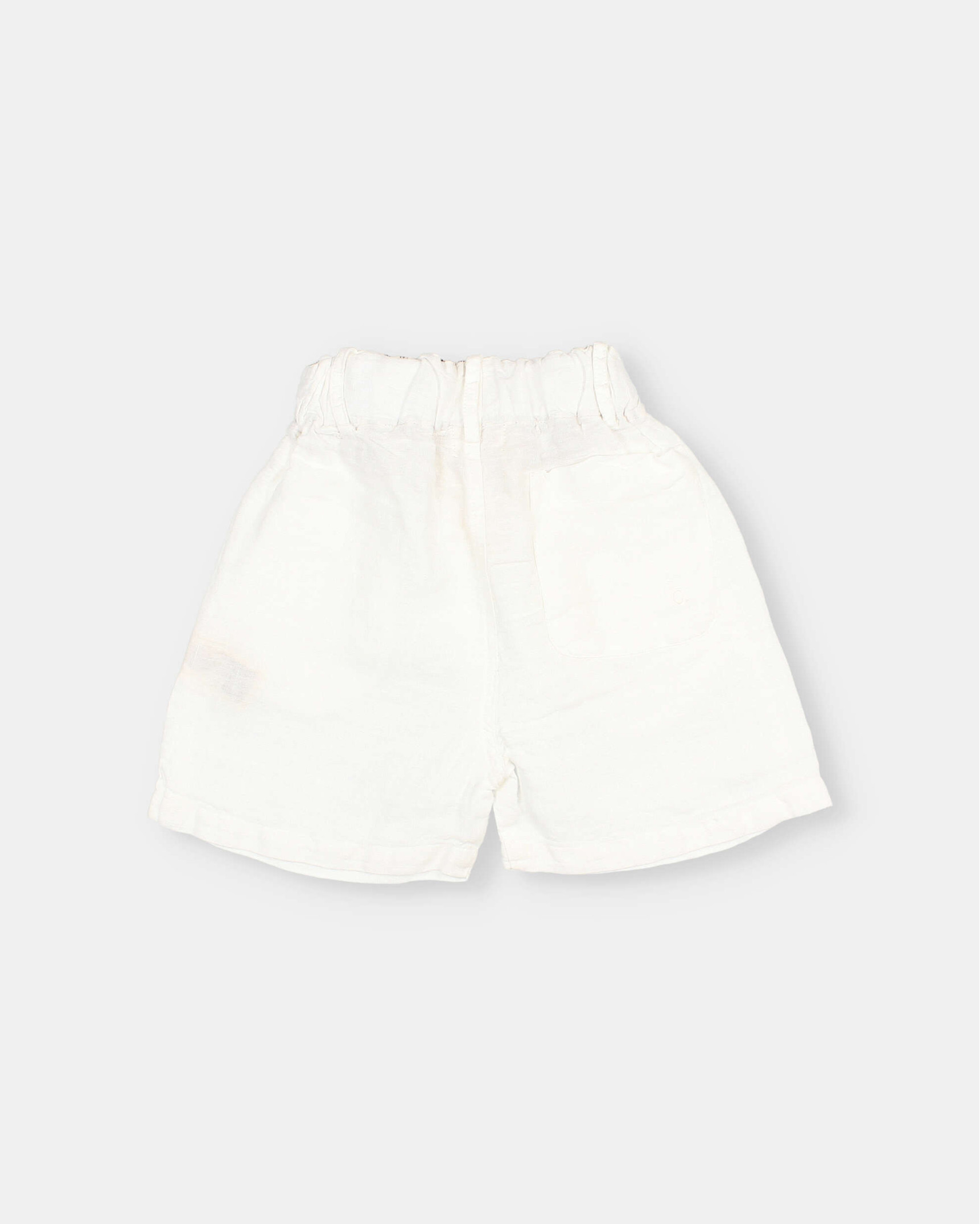 Pantalón corto de lino 100% con suave efecto lavado y un aire relajado. Cintura elástica con cinta de algodón interior para mejor ajuste. Botón decorativo enfrente. Bolsillos frontales. Bolsillo tipo plastrón en la espalda con detalle bordado al tono.